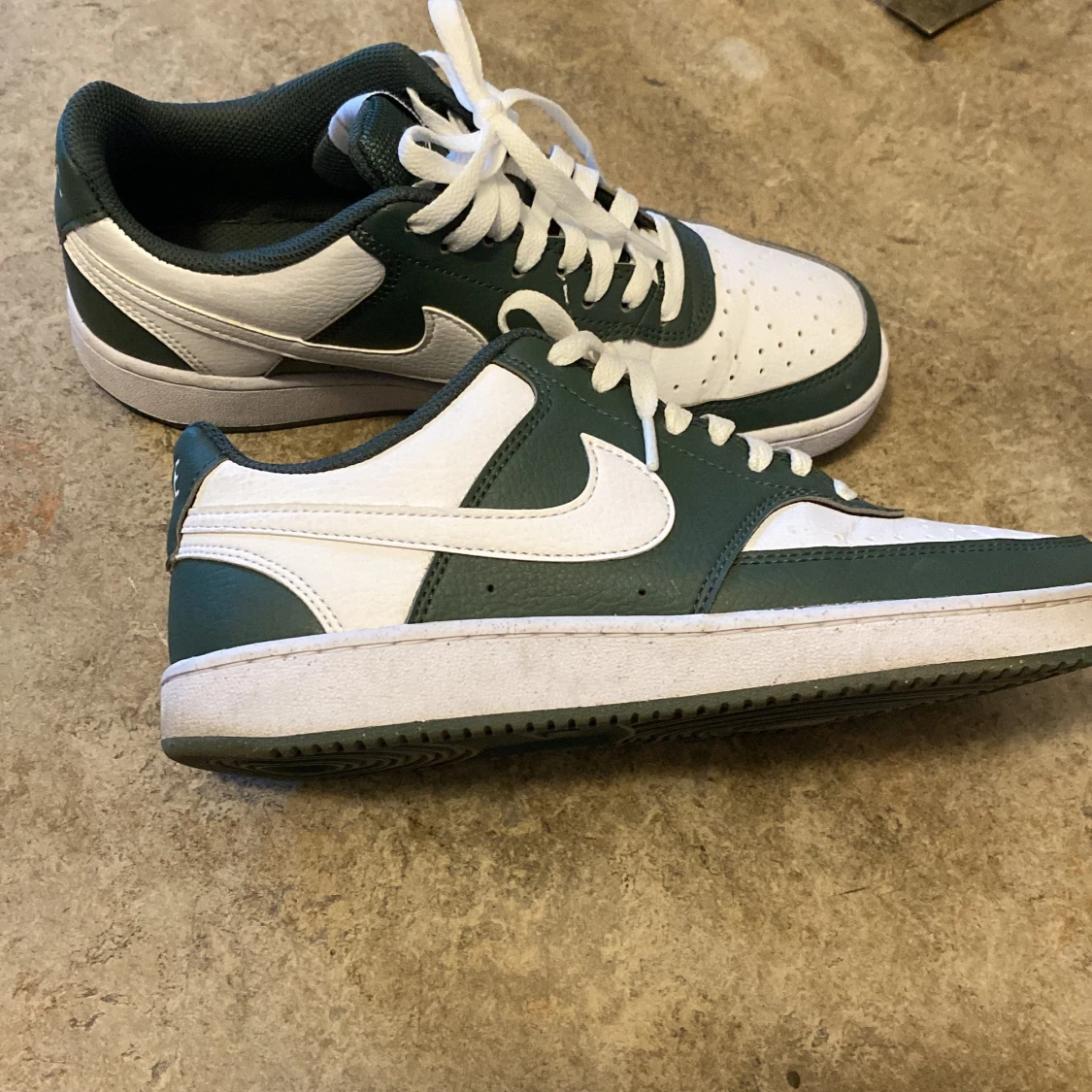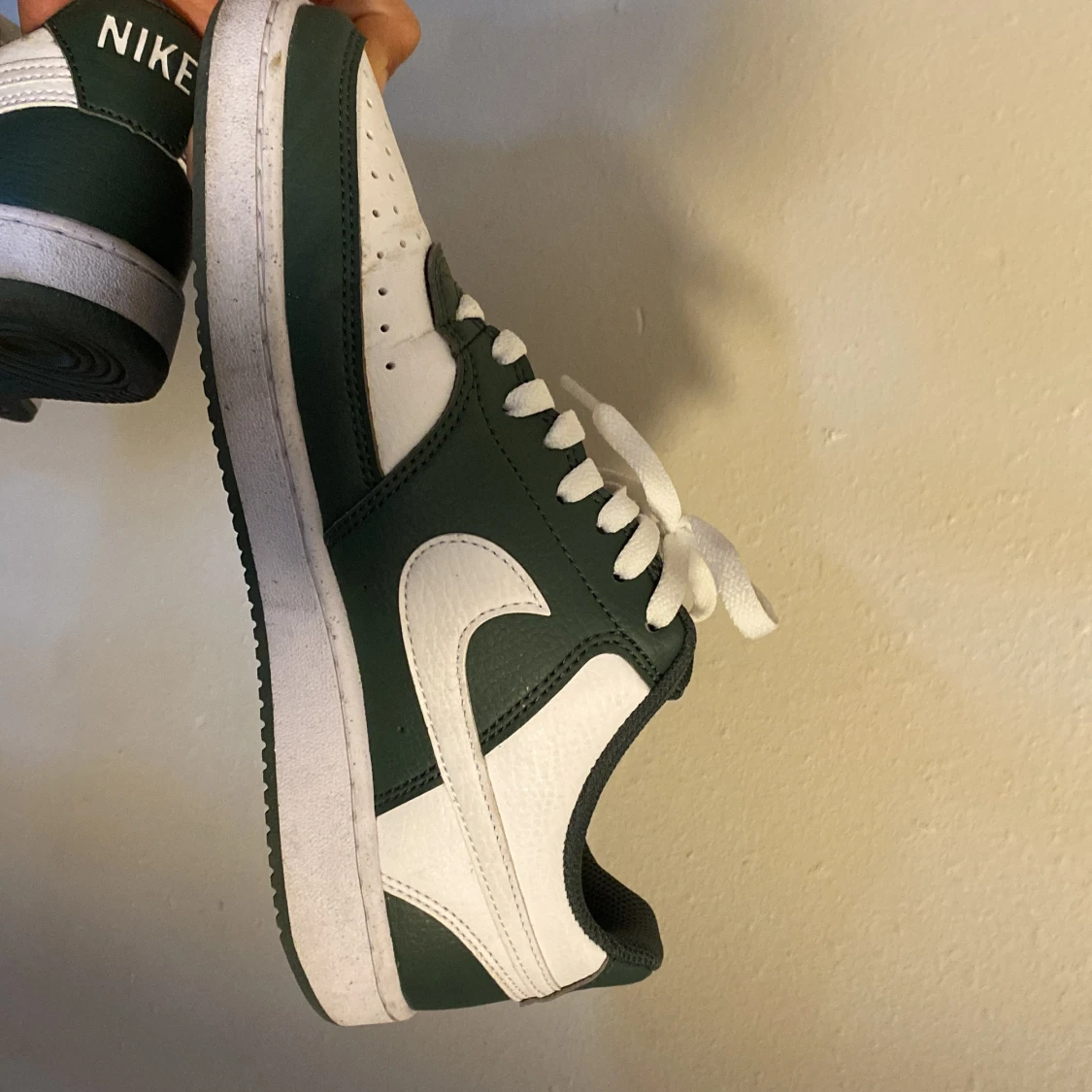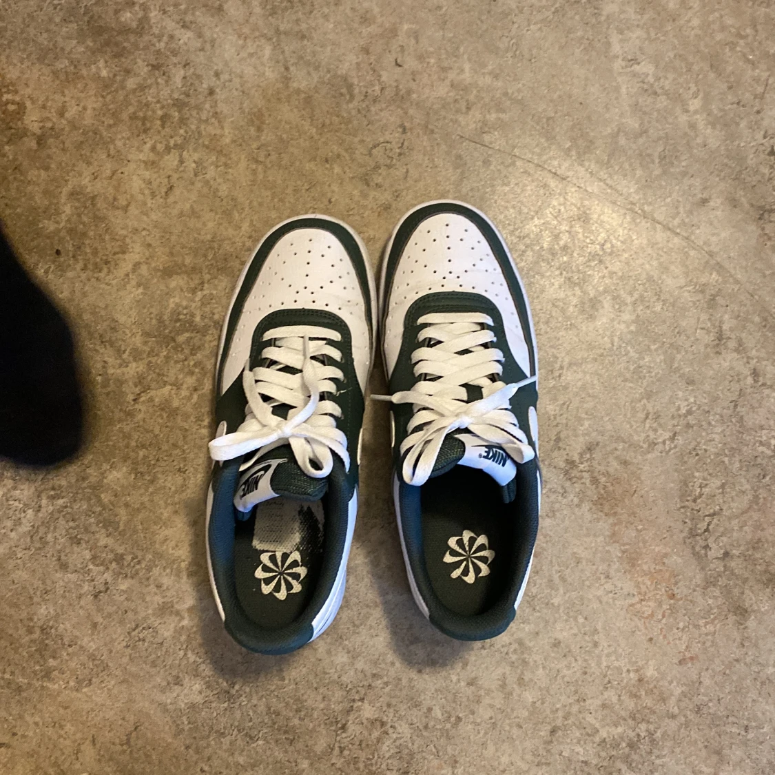Säljer ett par Nikeskor med vit bas och gröna detaljer. Skorna har klassisk rund tå, perforerad tåbox och vit sula. Swoosh-logga på sidan och vita skosnören. Perfekta för dig som gillar stilrena sneakers med en twist.