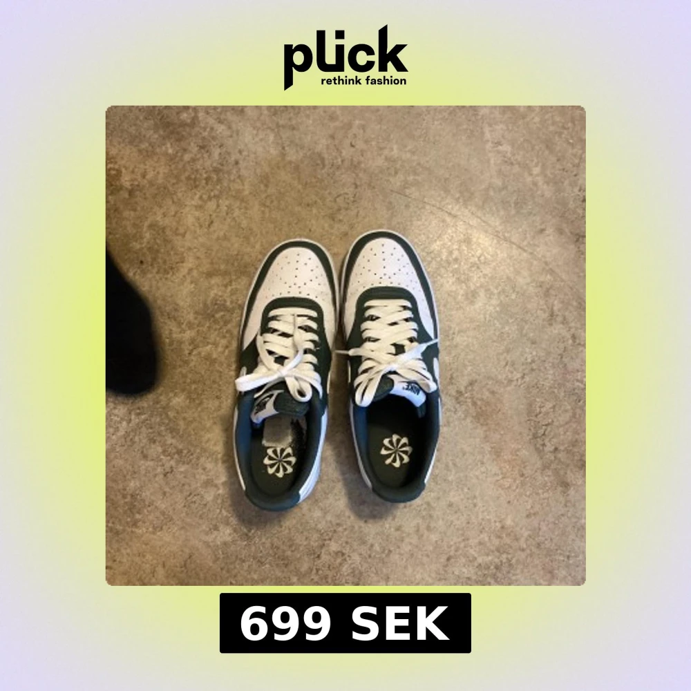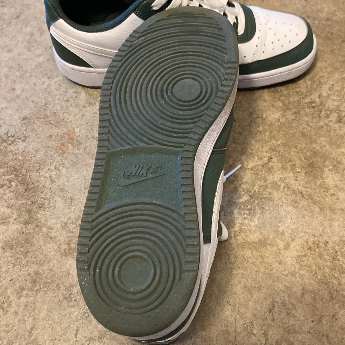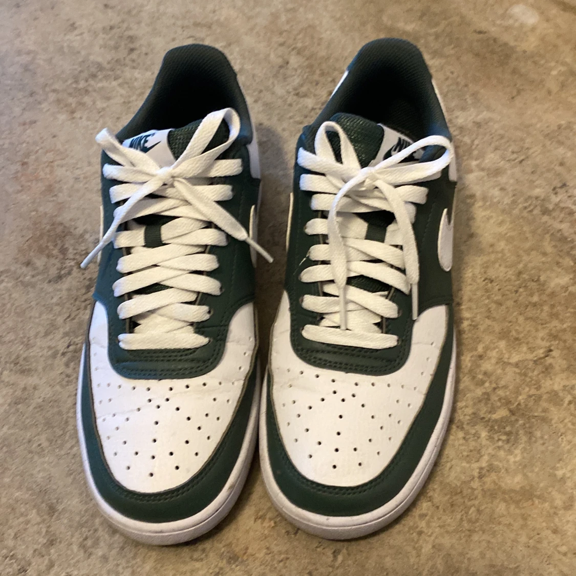 Säljer ett par Nikeskor med vit bas och gröna detaljer. Skorna har klassisk rund tå, perforerad tåbox och vit sula. Swoosh-logga på sidan och vita skosnören. Perfekta för dig som gillar stilrena sneakers med en twist.