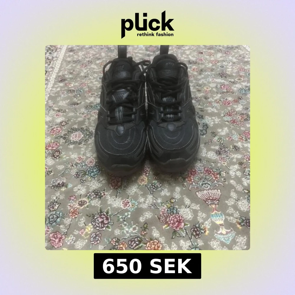 Säljer ett par helsvarta Nike Air Vapormax sneakers med tydlig Nike-logga på sidan. Skorna har snörning, rund tå och en unik, bubblig sula som ger en sportig look. Perfekta för dig som gillar streetwear och vill ha något bekvämt och stilrent.(Den har inga skosulor)