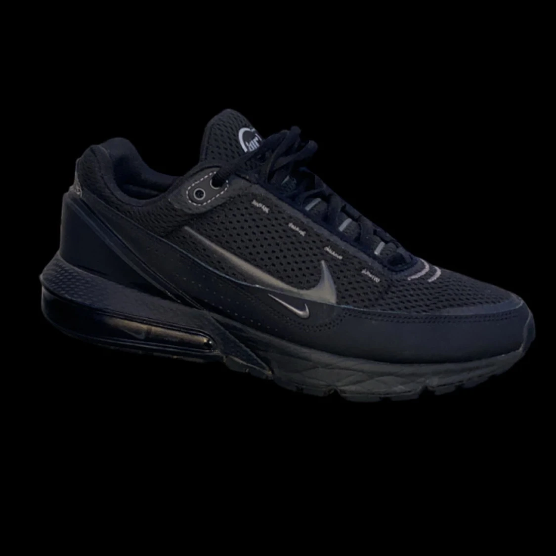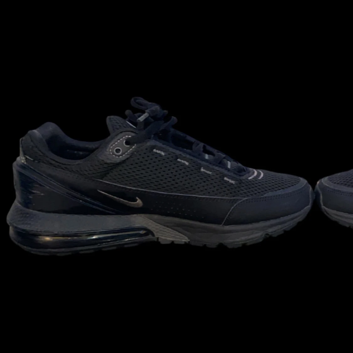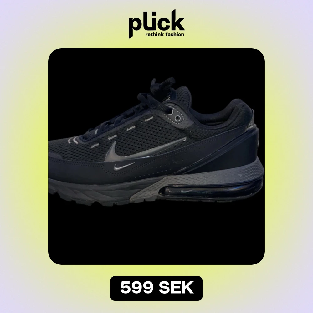 Säljer ett par svarta Nike sneakers i mycket bra skick. De har en stilren design med snörning och en bekväm sula. Perfekta för både vardag och träning. Skorna har en diskret Nike-logga på sidan och är gjorda i syntetmaterial för hållbarhet.