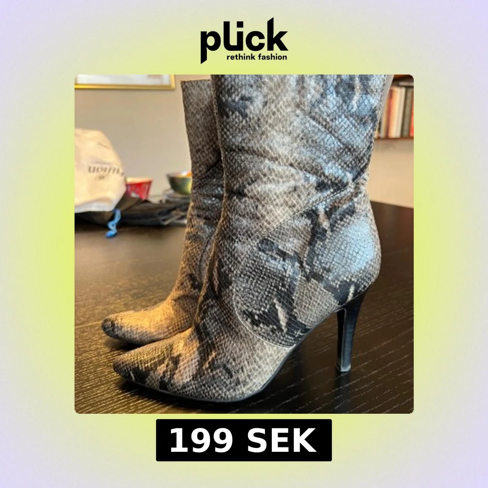Snygga boots med spetsig tå och hög klack i svart/brunt ormskinnsmönster. Skorna har dragkedja på sidan och en cool textur i läder. Endast använda ett fåtal gånger.