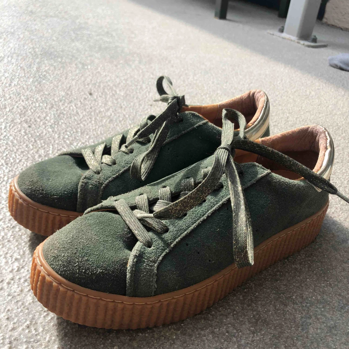Snygga gröna mockaskor med glittra snören. Använda några gånger.