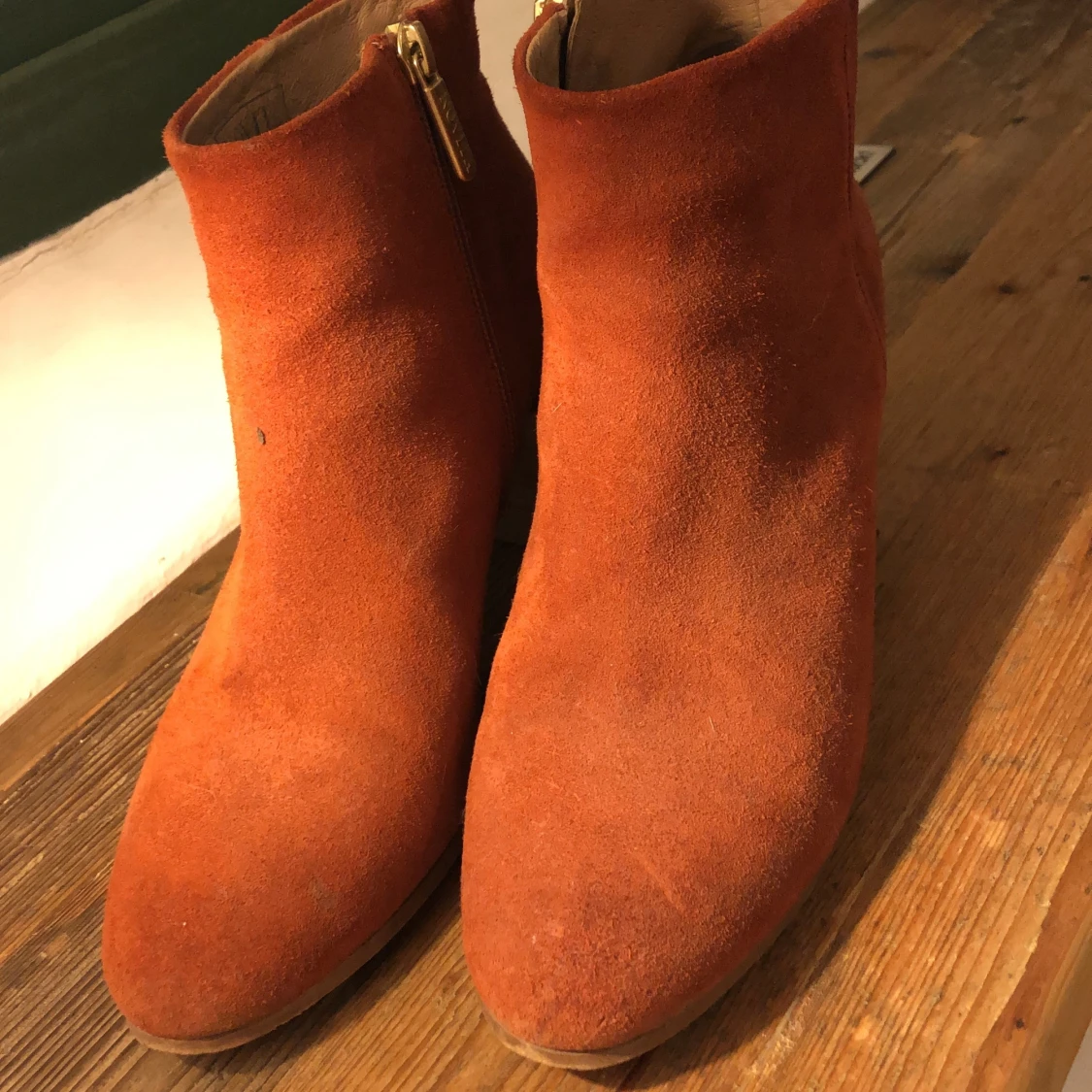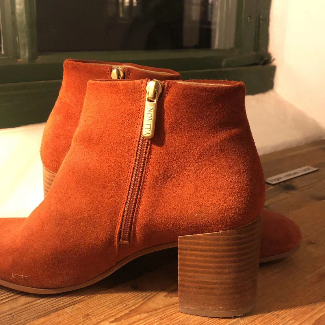 Oranga boots i mockaimitation med guldiga detaljer och träklack. Från märket novita, originalpris ca 1000kr. Klacken är ca 5-6cm