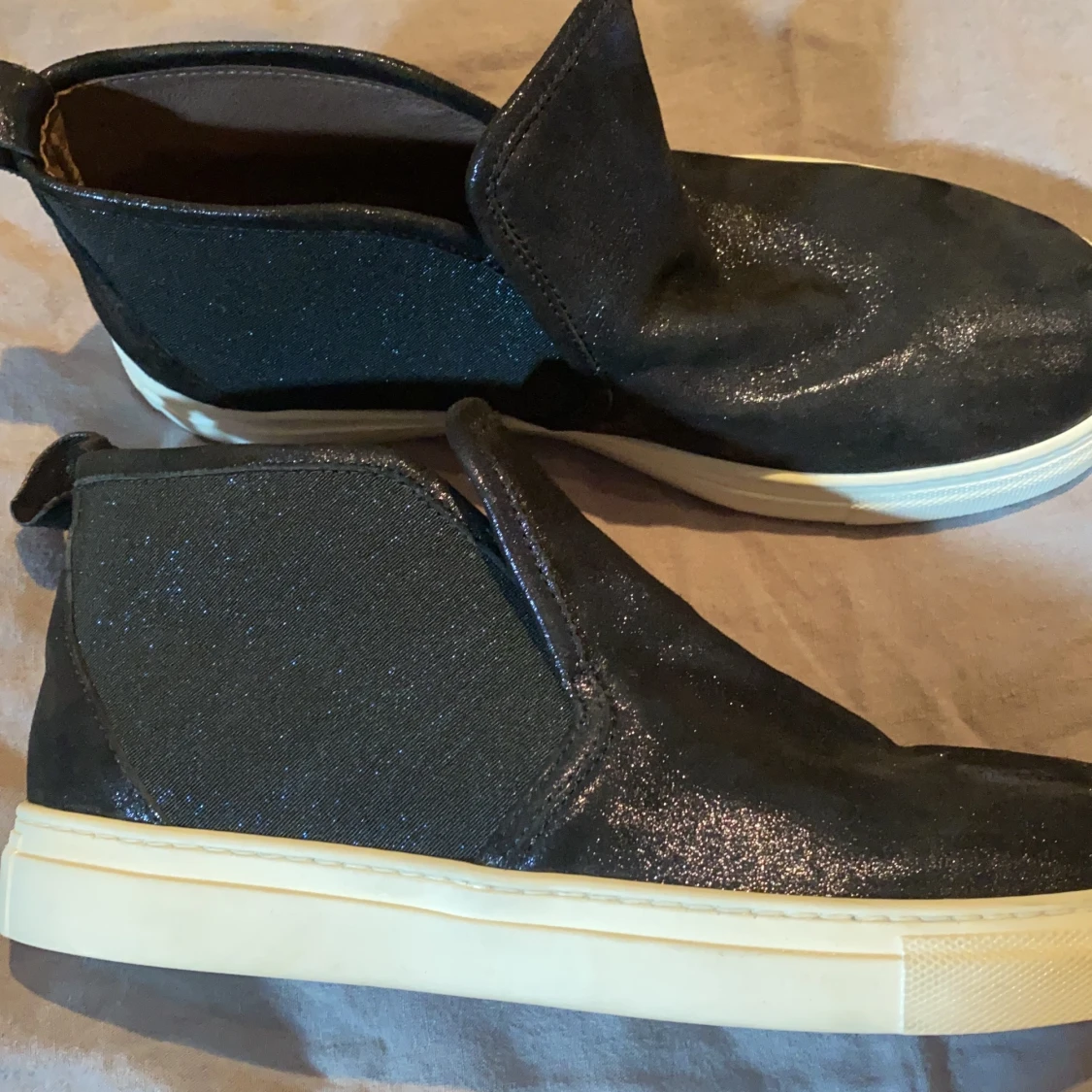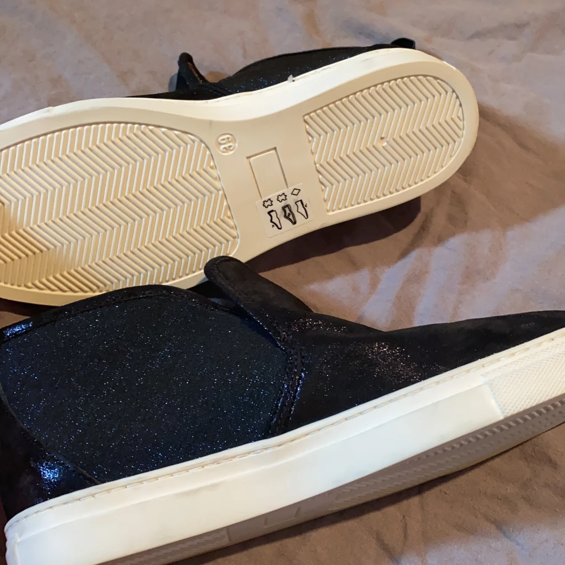 Helt oanvända!! Jätte coola blå glittriga skor, aldrig använda strl 39, köpta för ca 2000, mellan höga. Tyvärr har ena flärpen lossnat lite därbakom men inget man märker (bild 3), lägg bud