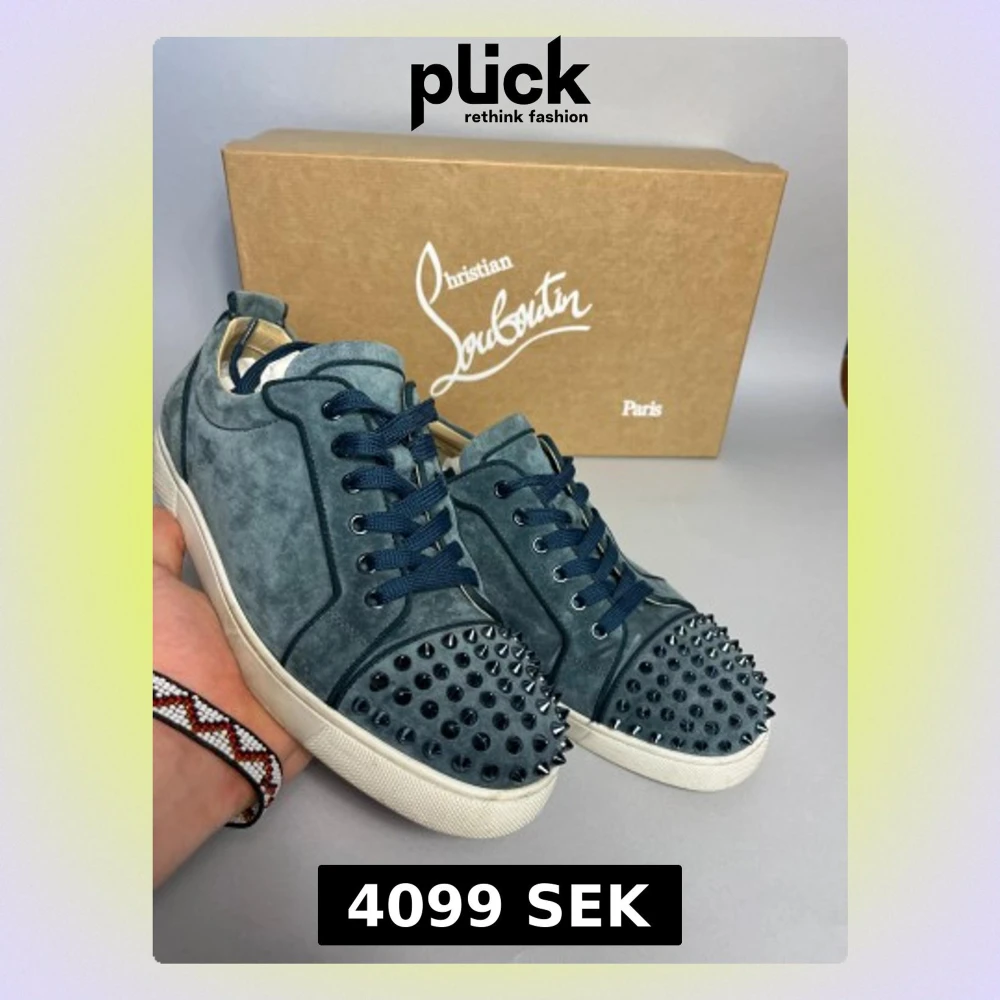 Snygga blå sneakers från Christian Louboutin i mocka med mörkblå snörning och vita sulor. Tåpartiet är täckt av svarta nitar som ger en edgy vibe. Insidan är beige och yttersulan har den klassiska röda Louboutin-loggan. Perfekt för dig som vill sticka ut. Storlek 39 men sitter som 40