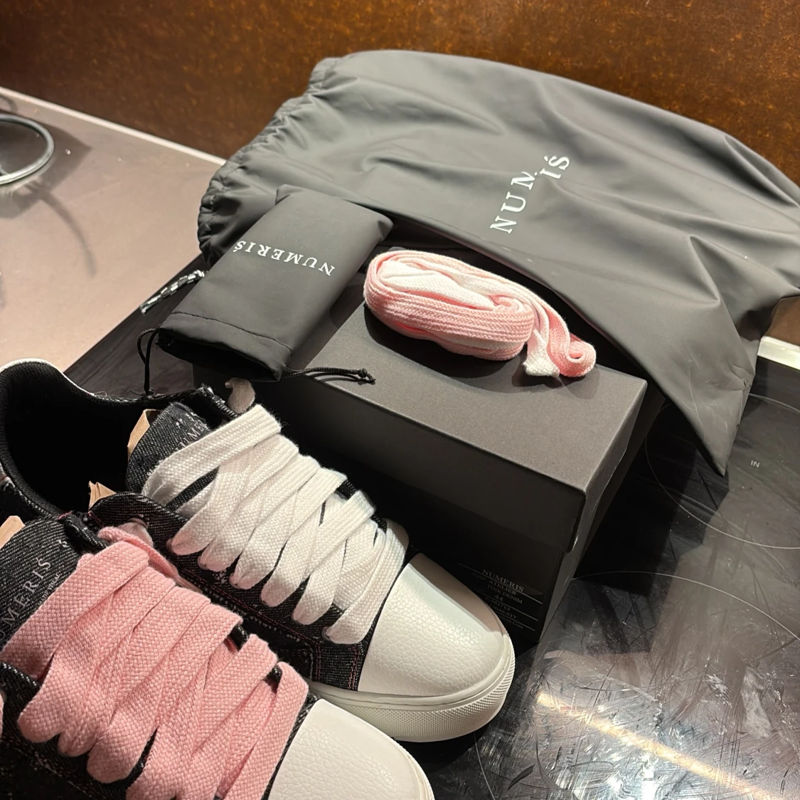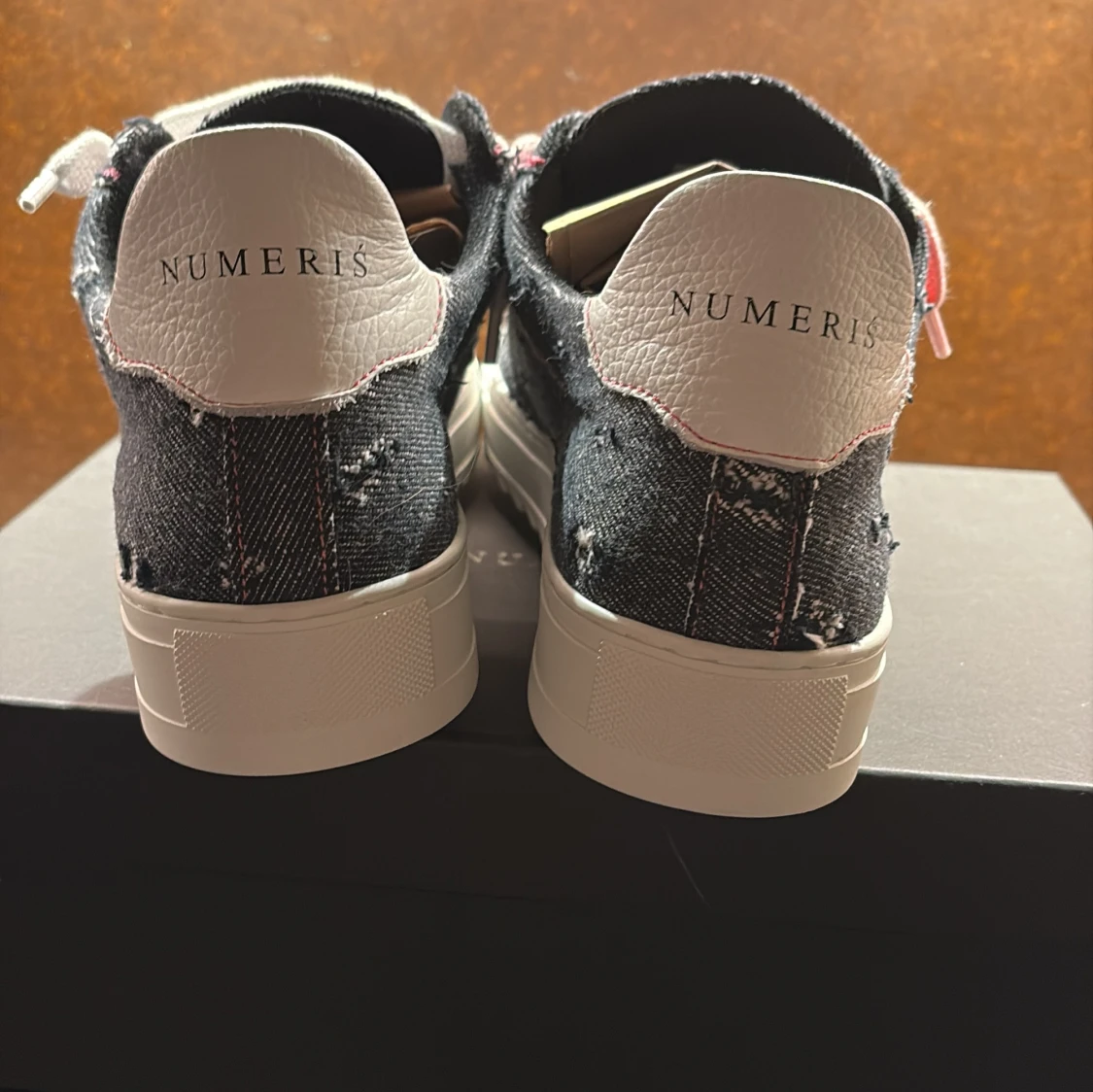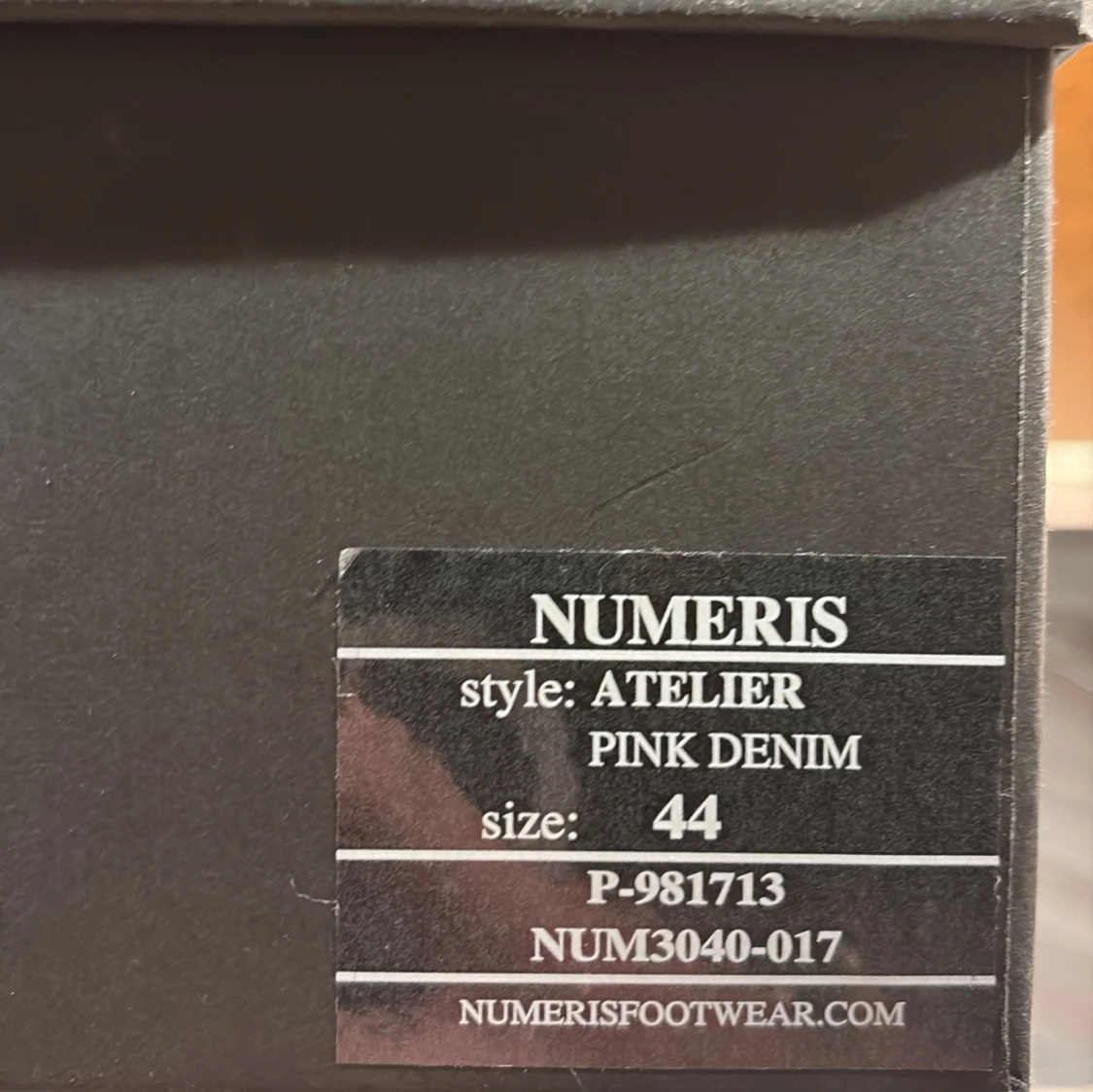 Snygga Numeris Atelier sneakers i storlek 44 med cool denimlook och slitna detaljer. Skorna har vit tå och häl i skinn, samt breda snören i både rosa och vitt för en unik stil. Perfekta för dig som vill sticka ut med en mix av street och casual vibes.