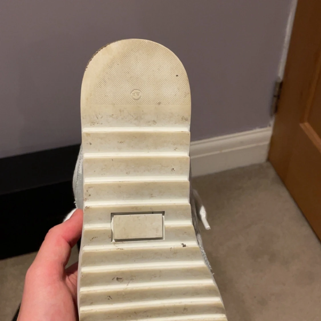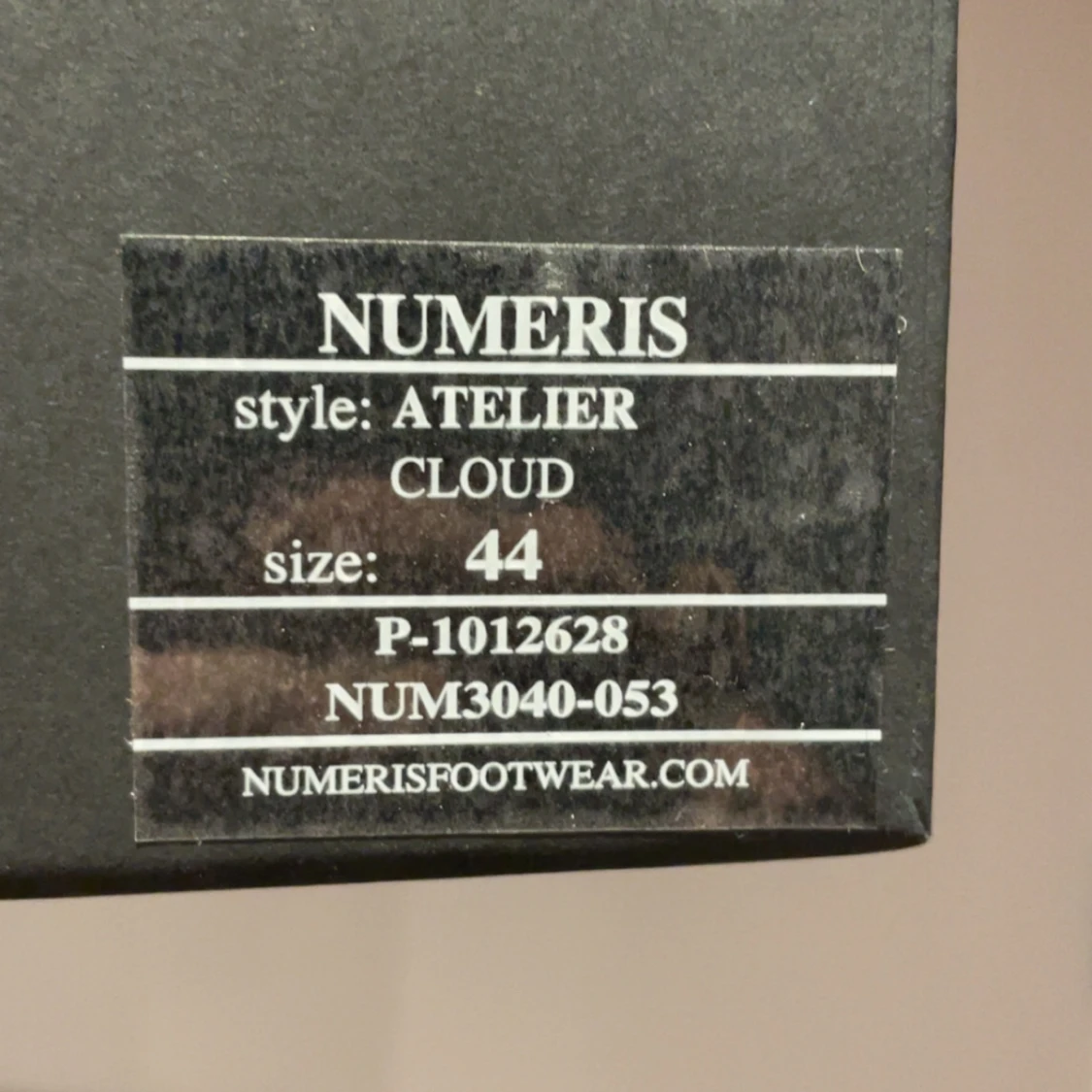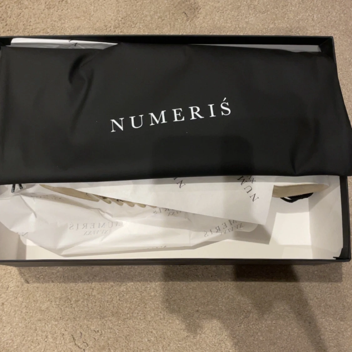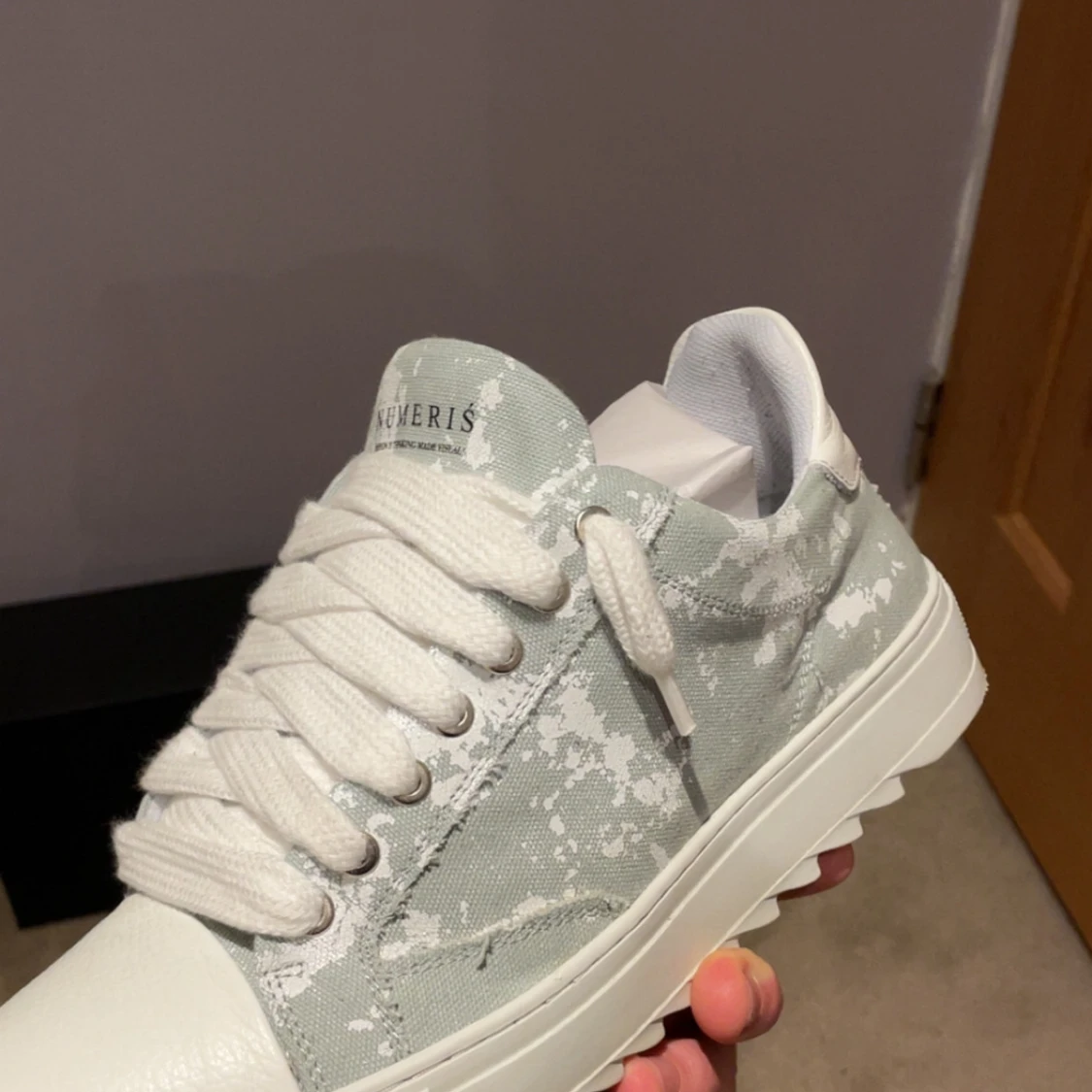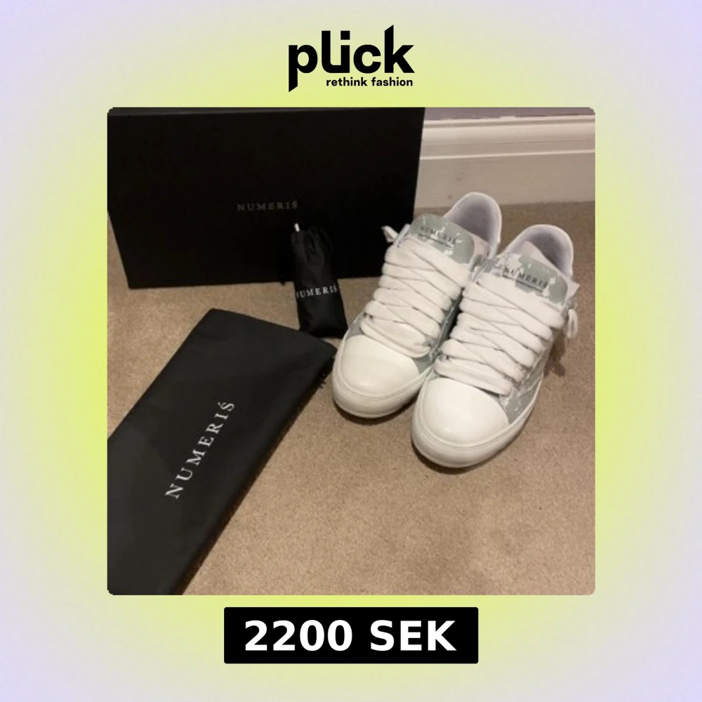 Snygga vita sneakers från Numeris med ljusgrått camouflagemönster och tjocka vita snören. Skorna har en rund tå, platt sula med räfflad undersida och är tillverkade i textil och skinn. Modell cloud, cirka 2500 kr utan frakt och går endast att köpa i Storbritannien. Använda en gång då de var för små. Man får med allt i bilden, extra snören, dustbag och låda.