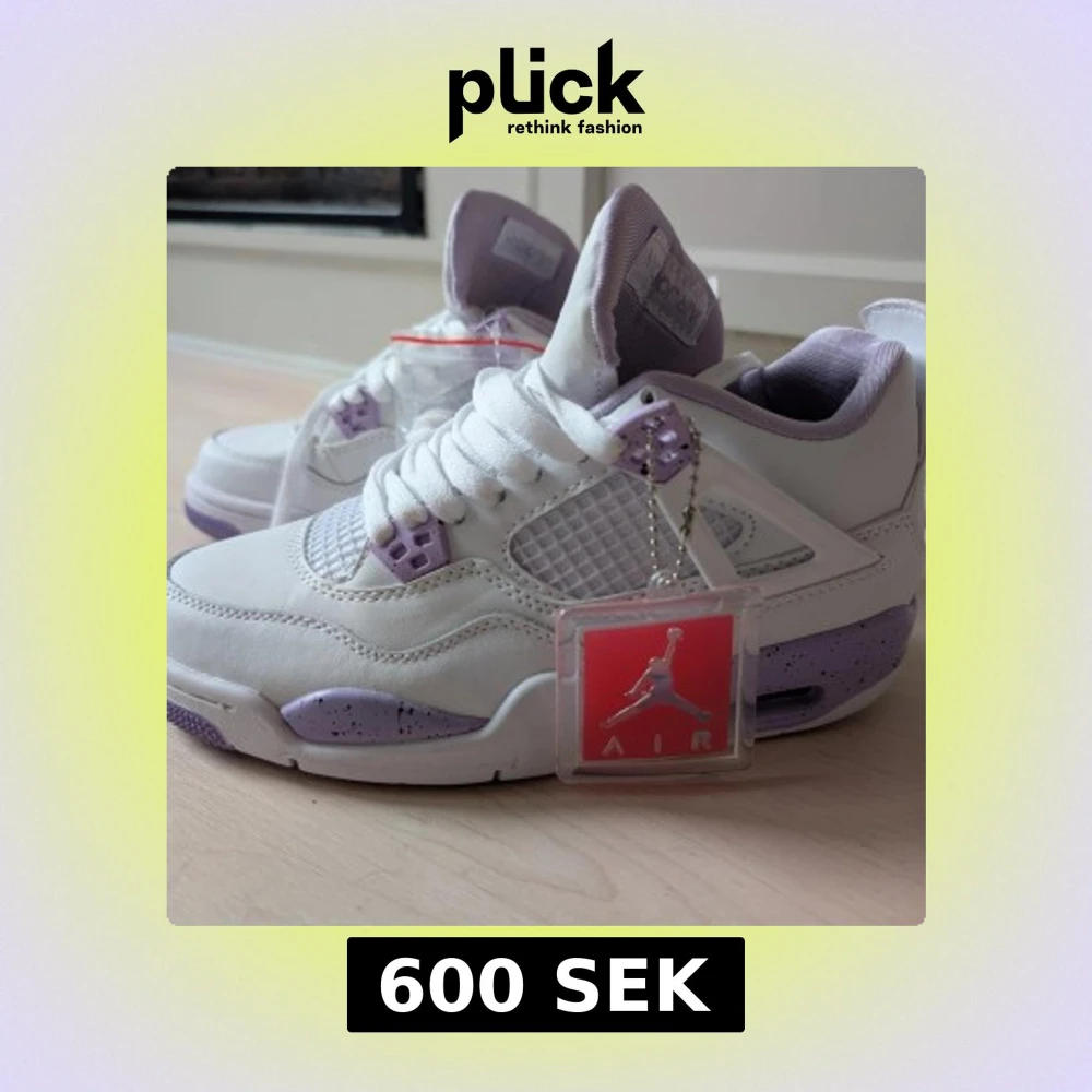 Säljer ett par Nike Air Jordan 4 Retro i vitt och lila med coola detaljer och specklad sula. Skorna har snörning, meshpaneler och ikoniska Jumpman-loggor på plös och häl. Perfekta för dig som vill sticka ut med en klassisk och trendig sneaker.