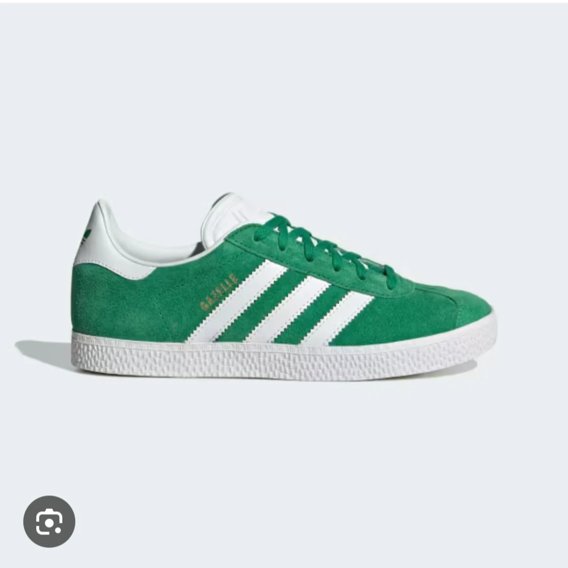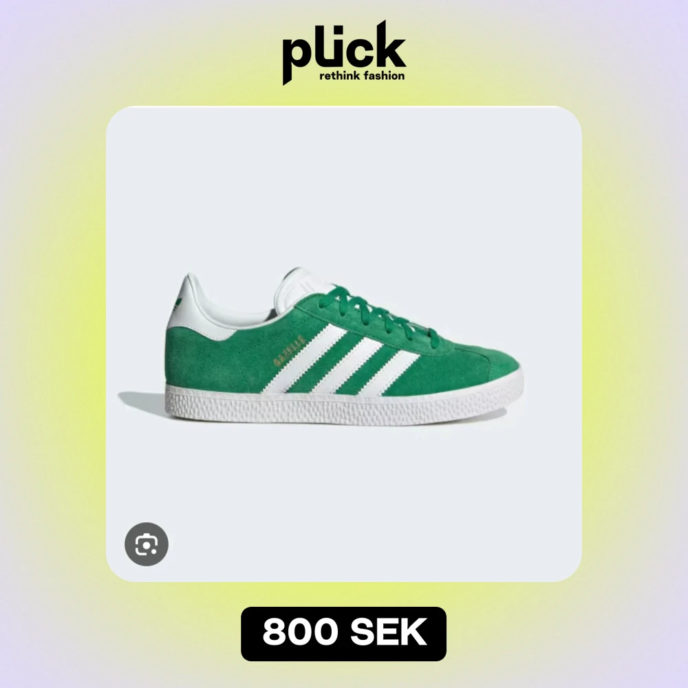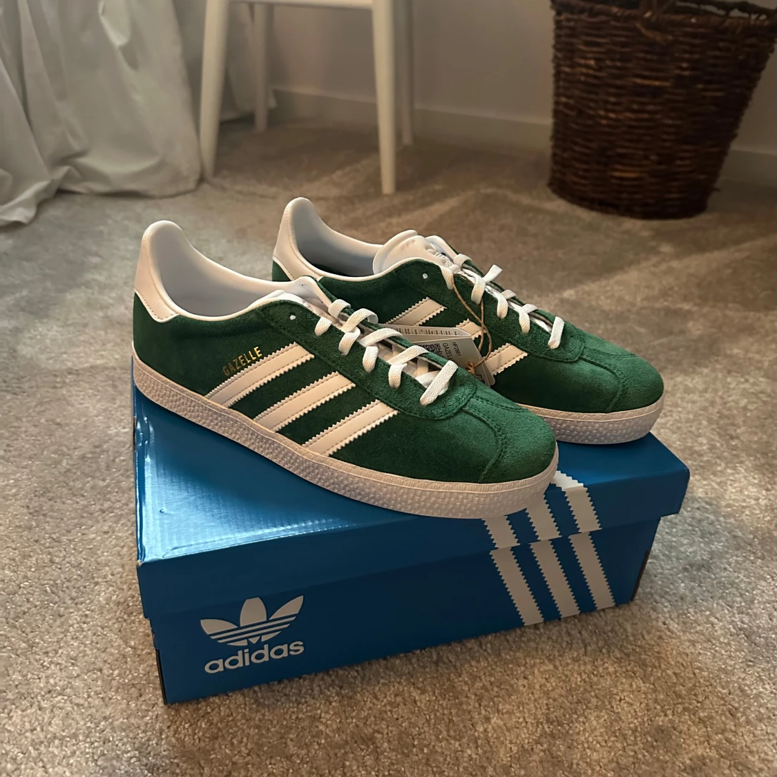 Säljer ett par snygga gröna Adidas Gazelle sneakers i mocka. De har de klassiska vita ränderna och en vit sula. Perfekta för en casual look och passar till nästan allt. Skorna är i nytt skick och kommer med originalkartong. Perfekt för dig som vill ha en stilren och tidlös sneaker! 💚