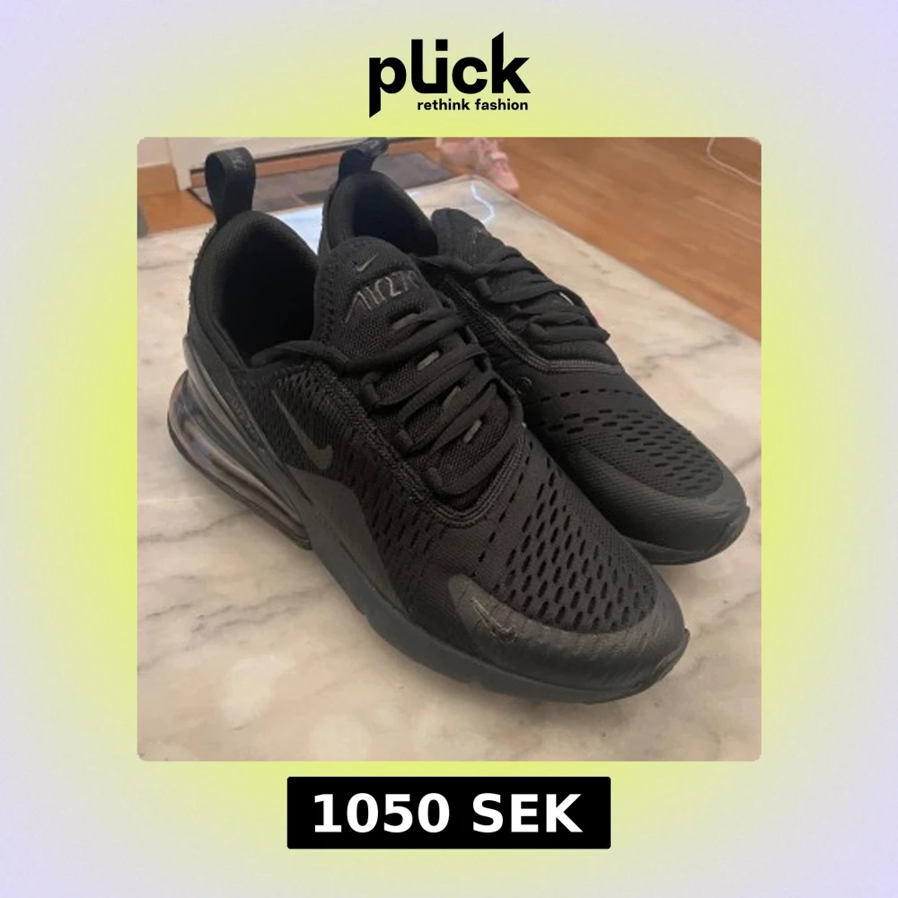 Hej! Jag säljer dessa helt svarta Nike Air Max 270 i storlek 42 köpta för 1400 . De har bara använts några gånger men är i nyskick. Köptes i december men blev för småa för min storebror och han vill bli av med de