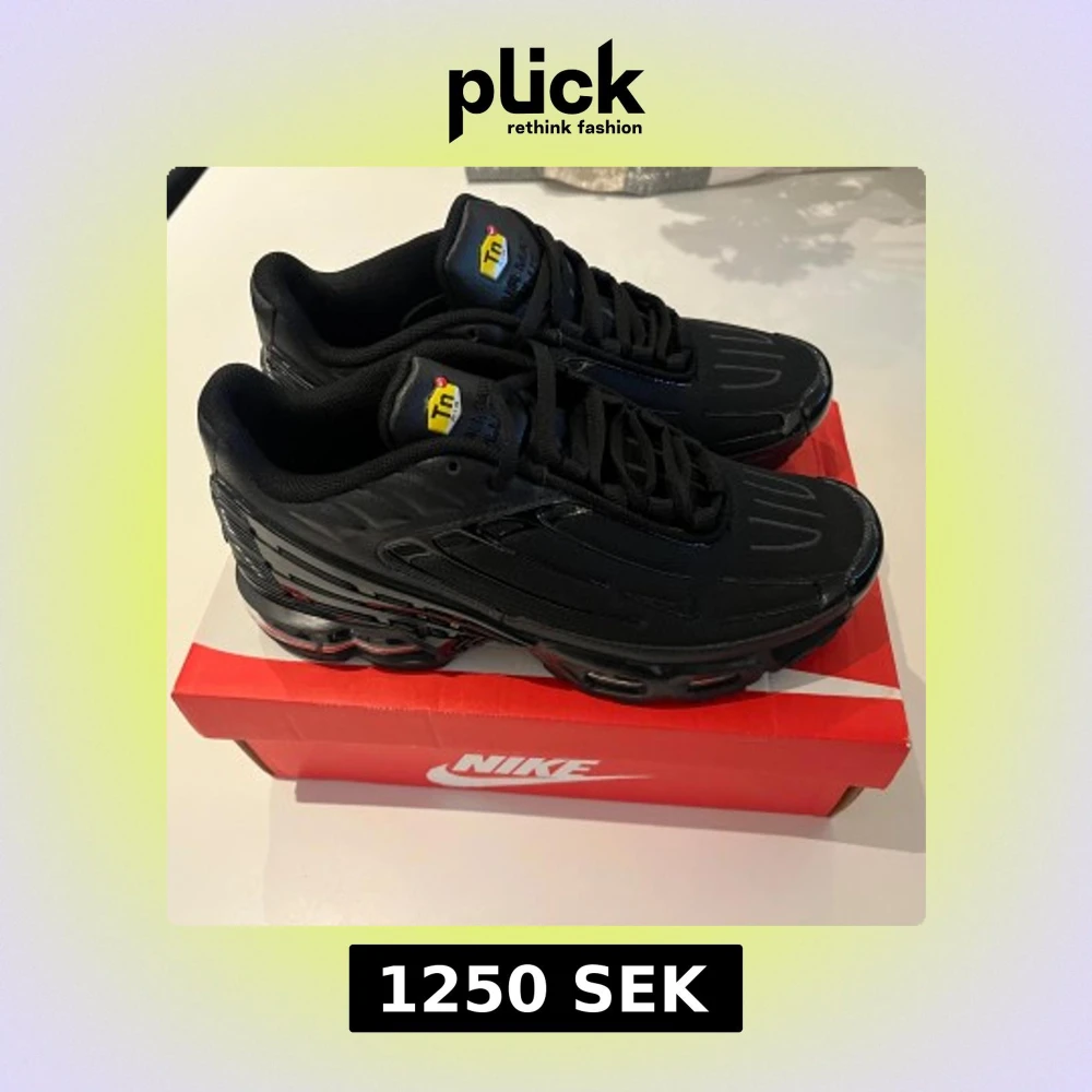 Nike Air Max Plus sneakers i helsvart färg med TN-logga på plösen och sidan. Snygg, sportig design med synliga luftkuddar i sulan och detaljer i blank syntet. Skorna har snörning och rund tå, tillverkade i textil och syntetmaterial.