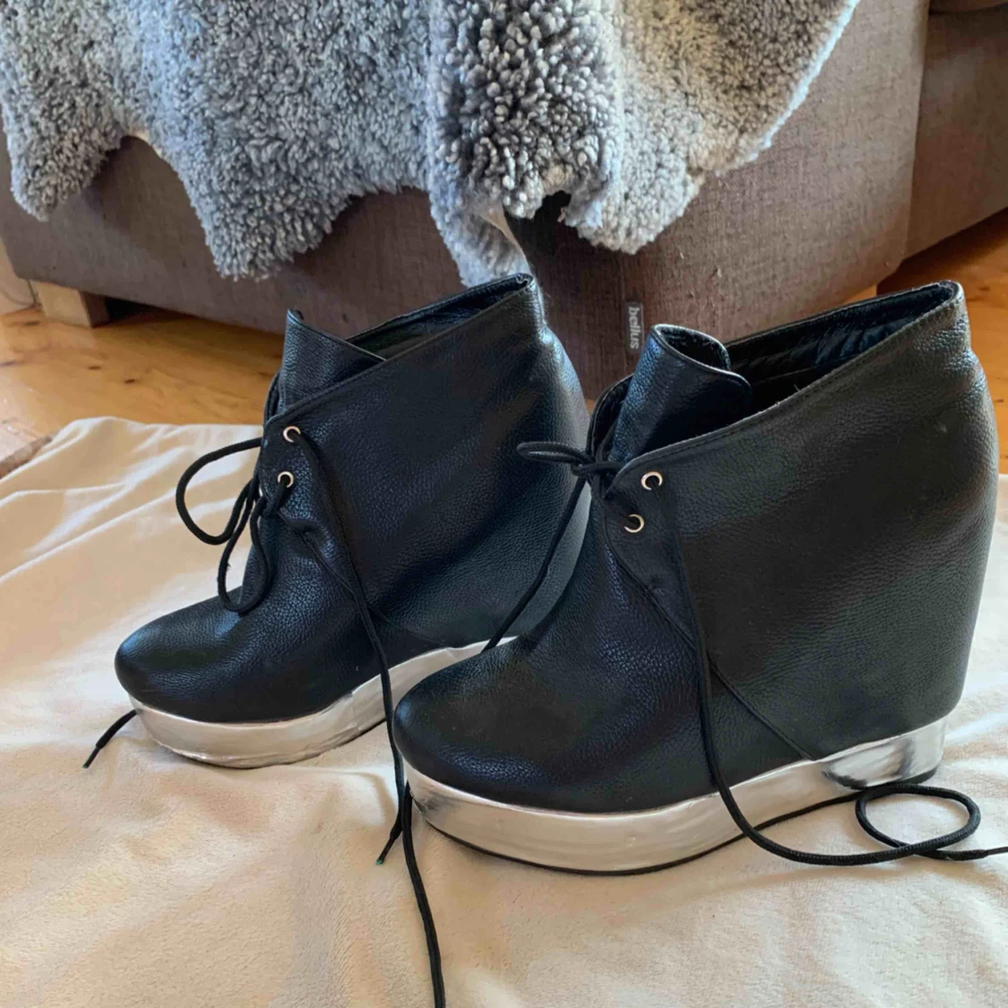 Höga kilklackar med snygga detaljer. Storlek 38. Fint använt skick. Finns en mil från Umeå (kan tas till centrum). Skickas mot fraktkostnad.