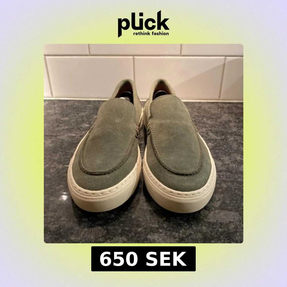 Snygga olivgröna loafers i mocka från These Glory Days. Skorna har en stilren design med vit sula och är perfekta för en avslappnad look. De är lätta att ta på och av, vilket gör dem praktiska för vardagsbruk. De är nästan oanvända jag har aldrig använt de för de har varit för små. Kan också byta mot något par skor de kan va i dåligt skick för mina skor har inte lika mkt värde. Kan gå ner i pris vid seriös köpare! MVH/NG Closet