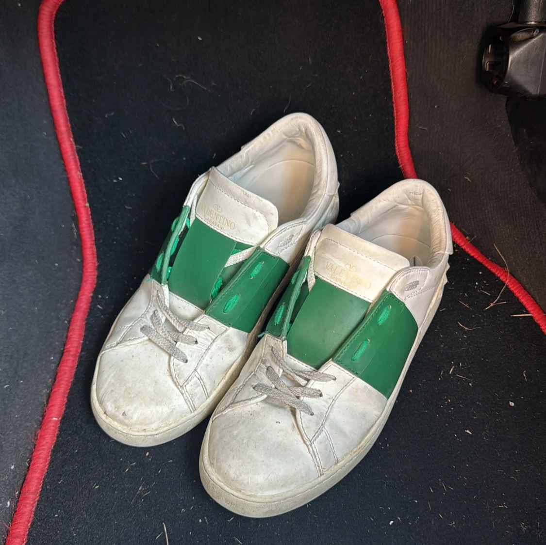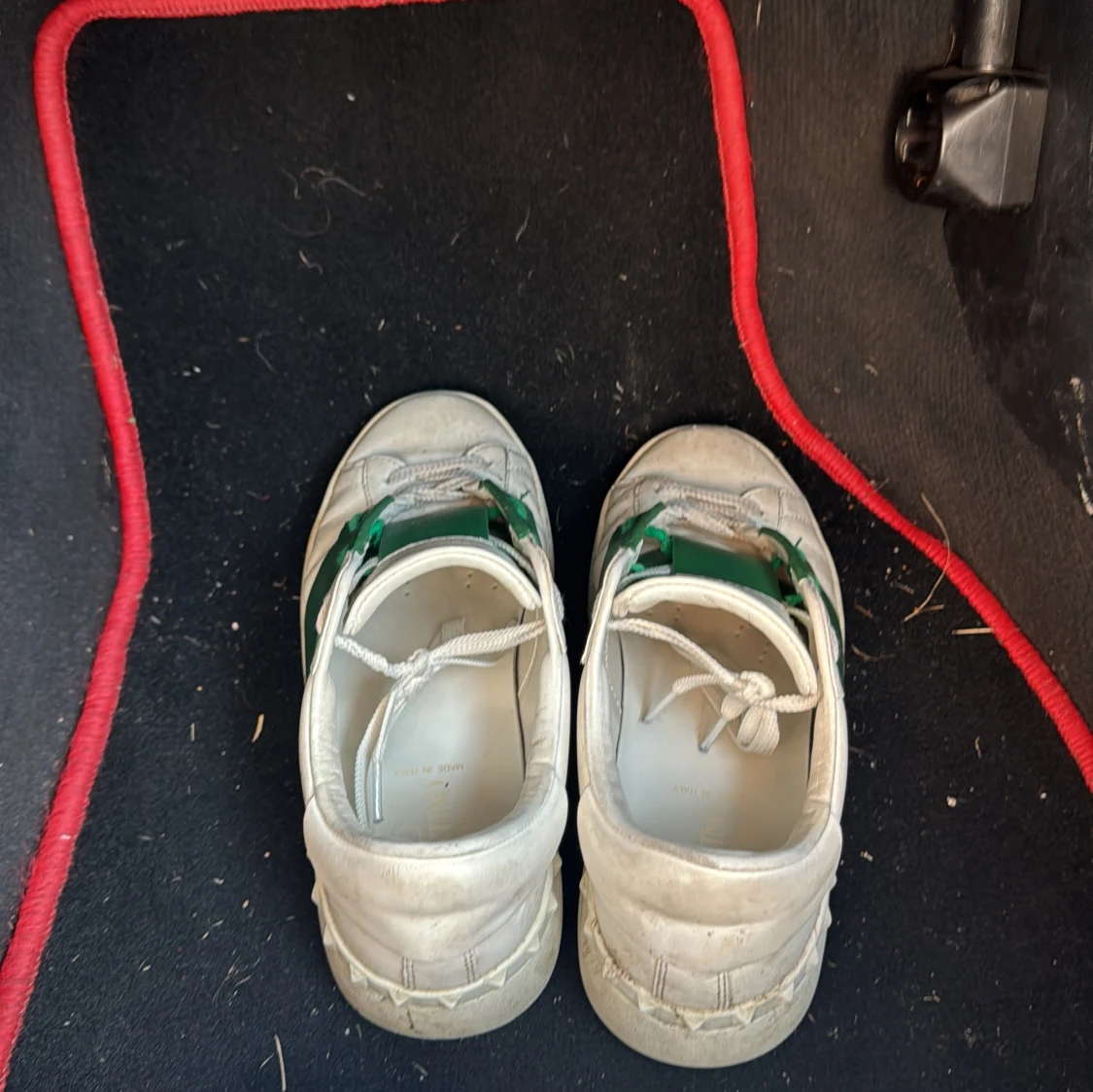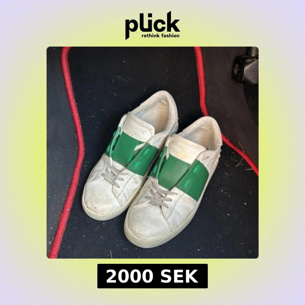Säljer ett par vita Valentino sneakers med bred grön rem över mitten och coola nitar baktill. Skorna har snörning och är tillverkade i skinn. Klassisk rund tå och platt sula. Perfekta för dig som vill sticka ut med en lyxig touch.