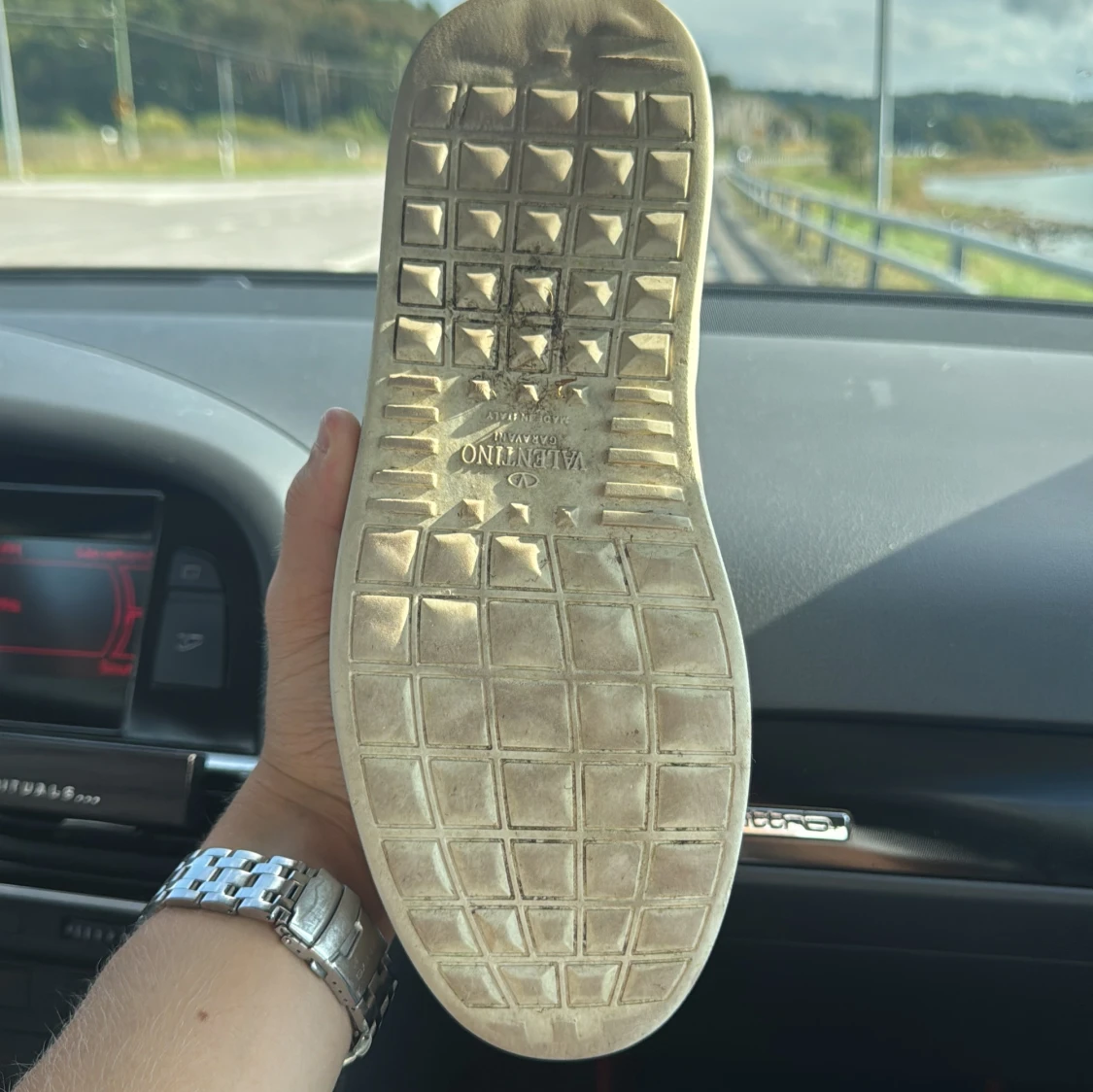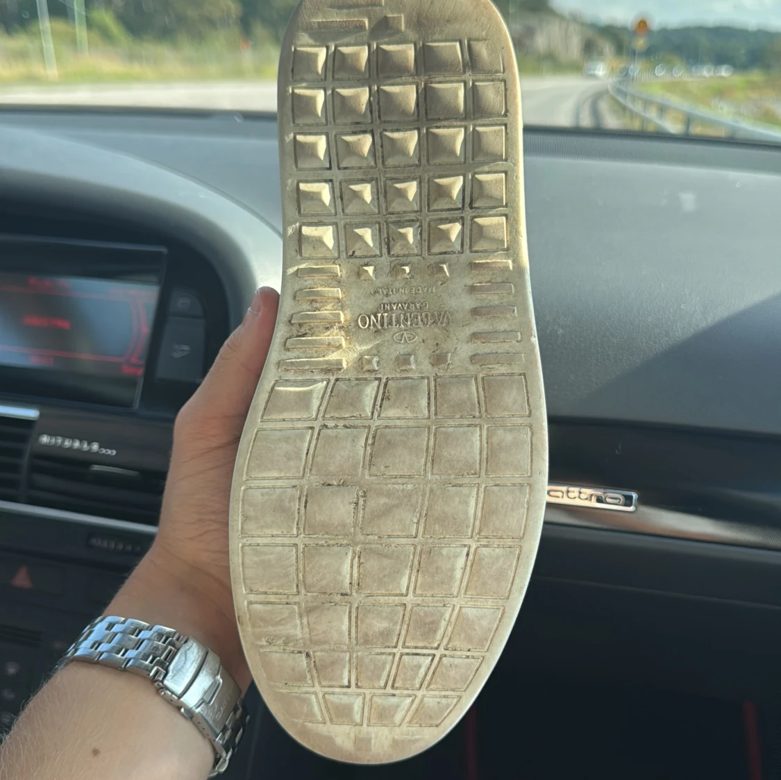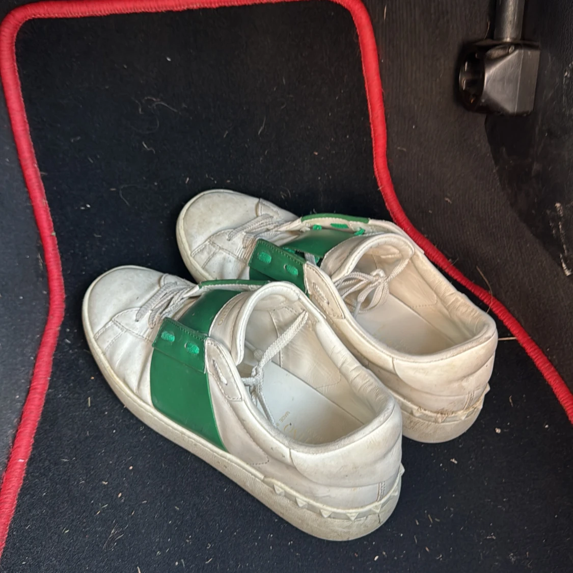 Säljer ett par vita Valentino sneakers med bred grön rem över mitten och coola nitar baktill. Skorna har snörning och är tillverkade i skinn. Klassisk rund tå och platt sula. Perfekta för dig som vill sticka ut med en lyxig touch.