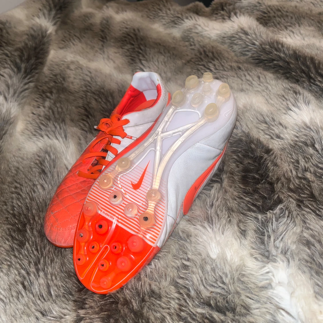 Snygga orangea fotbollsskor från Nike med vita detaljer och snörning. Skorna har en quiltad yta och är designade för optimal prestanda på planen. Perfekta för fotbollsspelare som vill sticka ut.