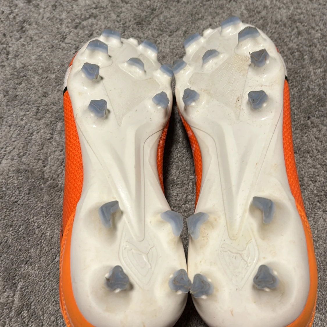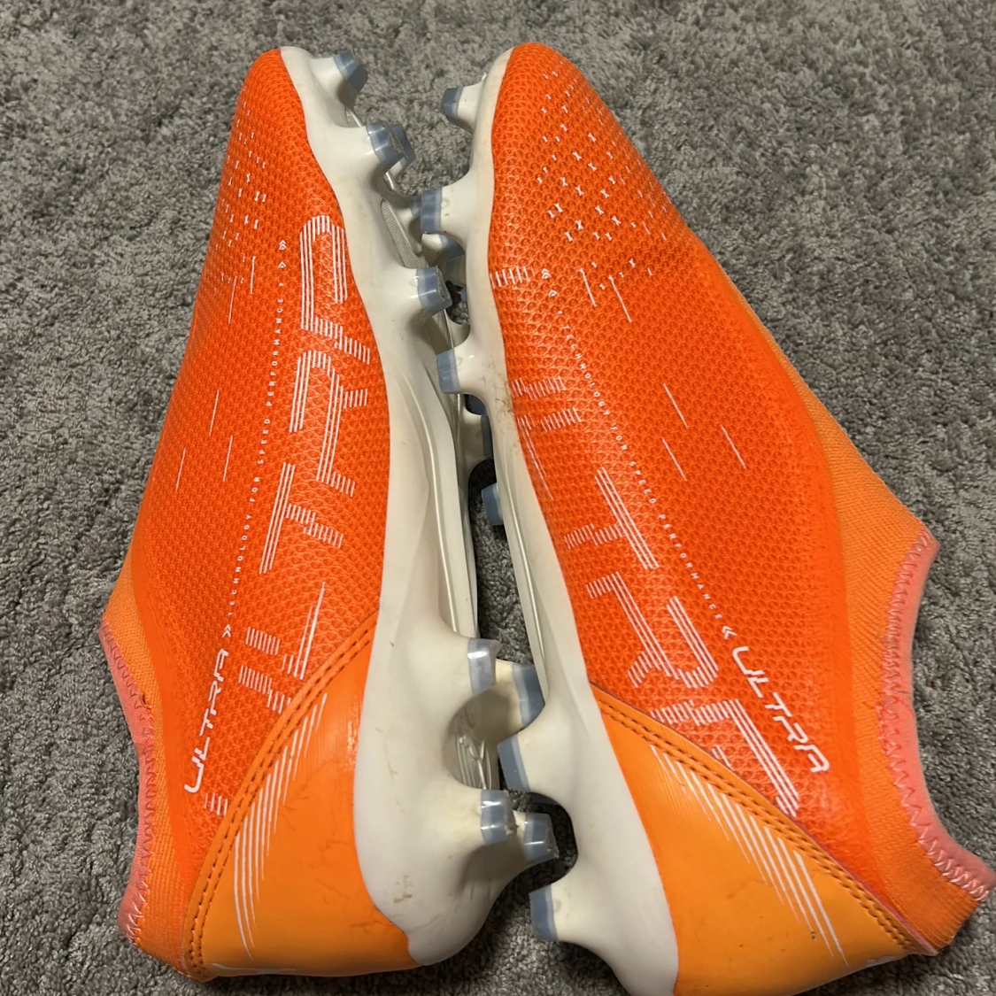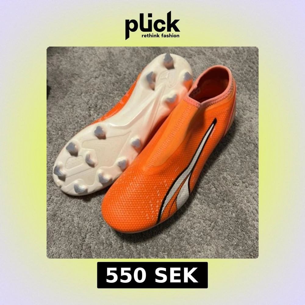 Säljer ett par orangea Puma Ultra fotbollsskor med vit och svart logga på sidan. Skorna har en slät ovandel utan snörning och fasta dobbar för spel på gräs. Tillverkade i syntetmaterial och designade för snabbhet på planen. De är använda 2 gånger då jag slutade i fotboll efter att jag köpt de.