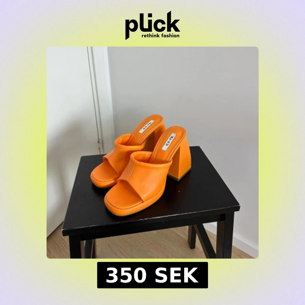Säljer ett par trendiga orange sandaler från NA-KD med bred rem och öppen tå. Skorna har en hög, kraftig klack och platt sula framtill. Perfekta för att addera färg till din outfit!