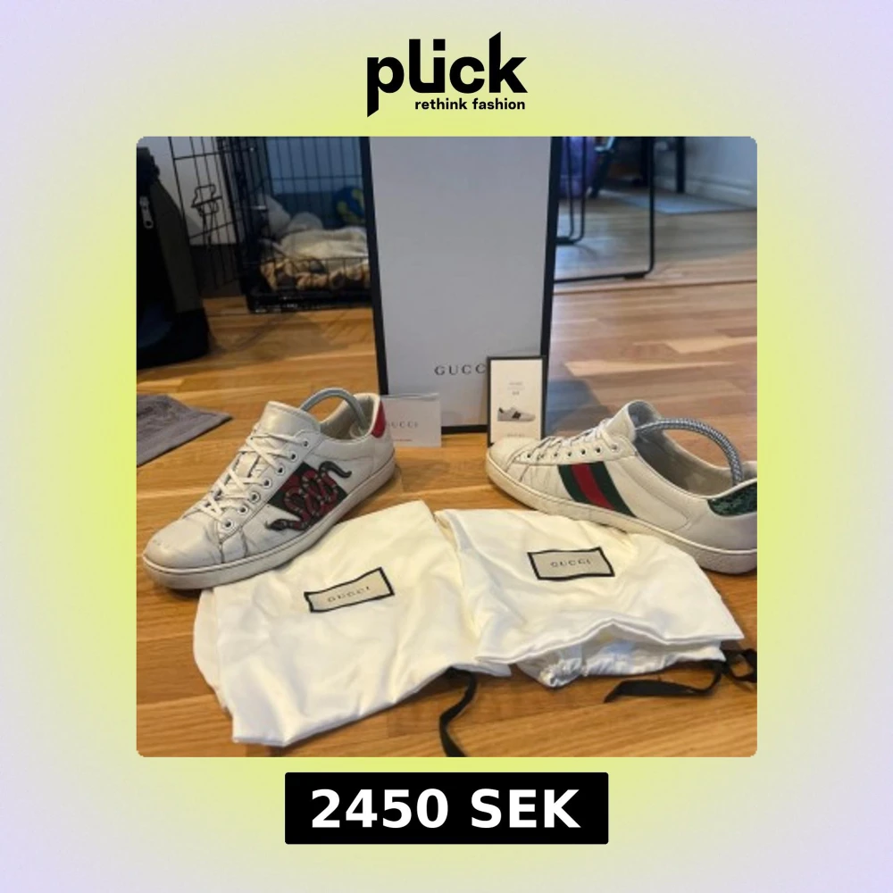 Gucci Ace sneakers i vitt skinn med klassiska gröna och röda ränder på sidan samt broderad orm. Baksidan har metallic-detaljer i rött och grönt. Skorna har rund tå och platt sula. Säljes med originalpåse och låda. Skorna är i 8/10. Box, dust bag, kort tillkommer✅hör av dig vid eventuella frågor 😊