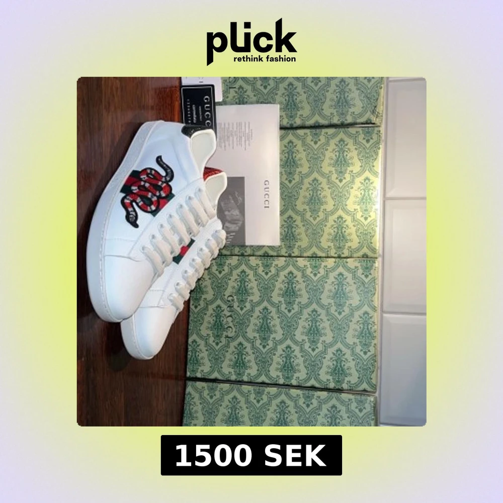 Gucci Ace sneakers i vitt skinn med klassiska gröna och röda ränder på sidan, dekorerade med en broderad röd och svart orm. Baksidan har metallicdetaljer i rött och grönt med textur. Skorna har snörning och platt sula, samt rund tå. Perfekt statement piece för dig som gillar lyx och att sticka ut.