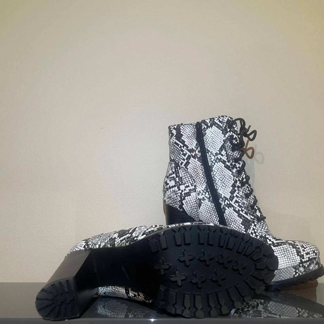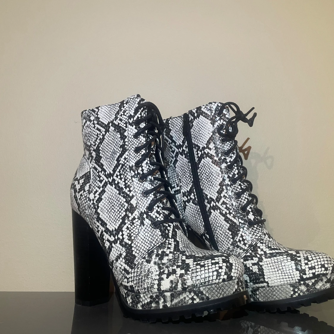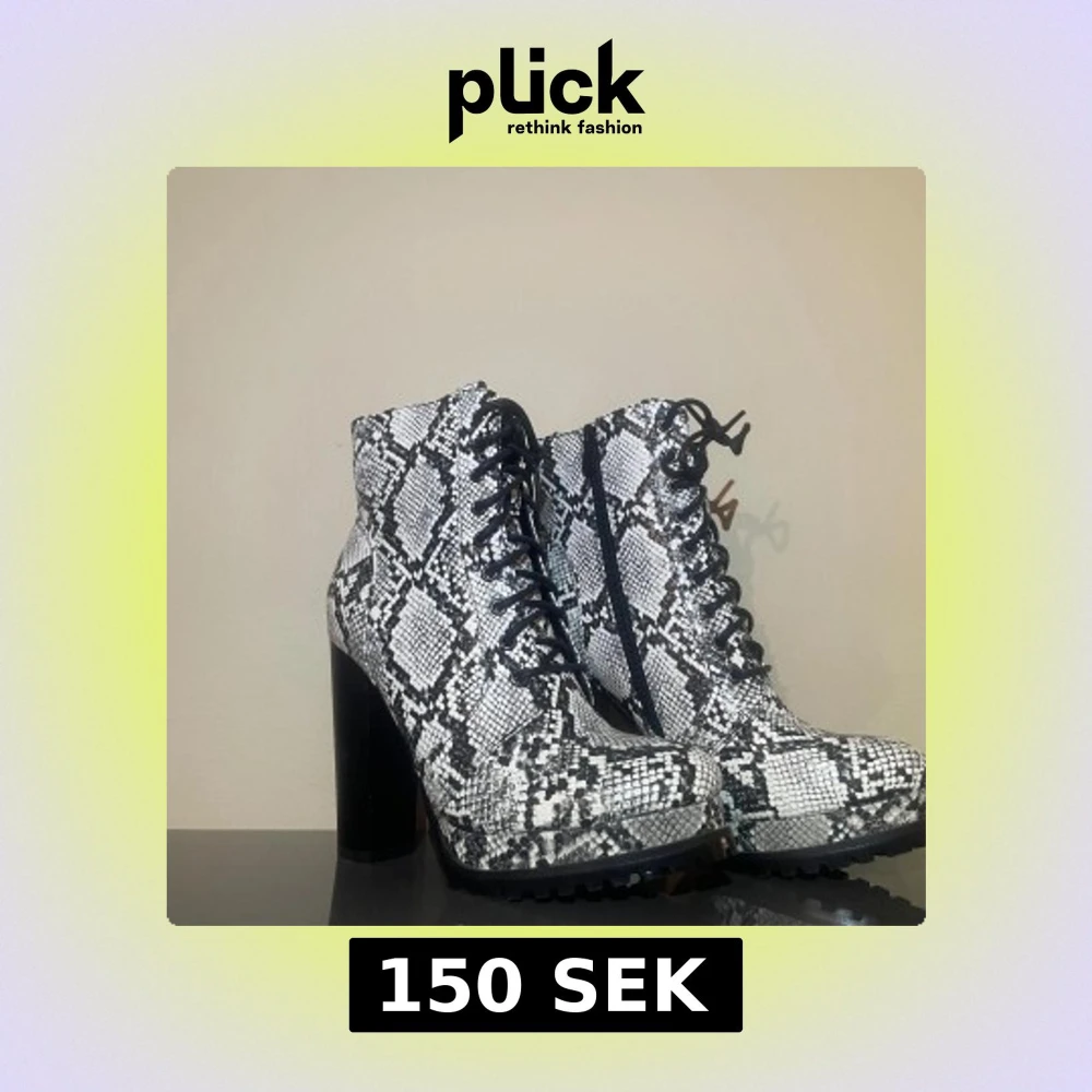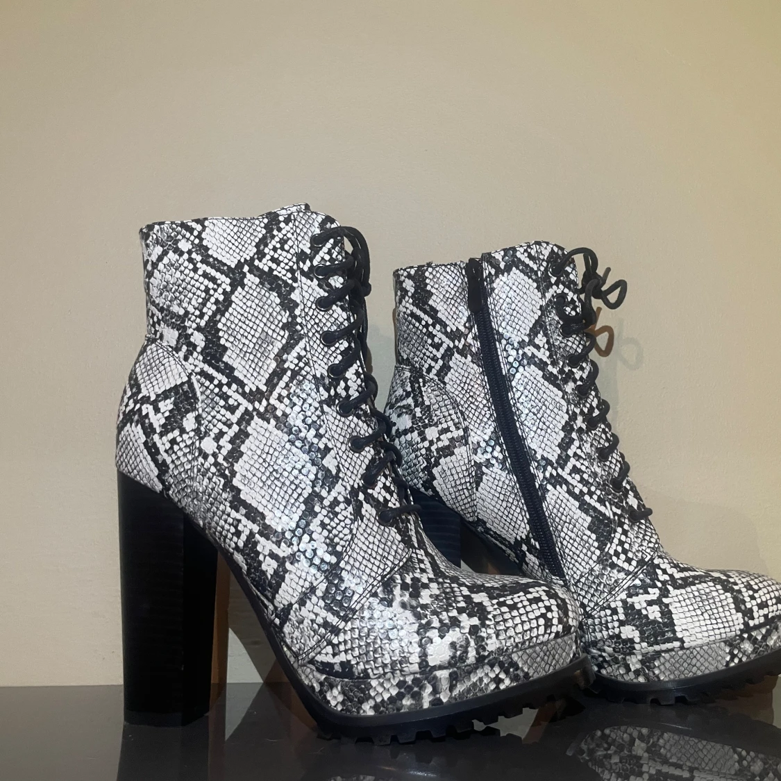 Säljer ett par boots med chunky hög svart klack och snörning, täckt i svartvitt ormmönster. Skorna har grov sula för extra grepp och dragkedja på insidan för enkel påtagning. Perfekt statement piece för dig som vill sticka ut.