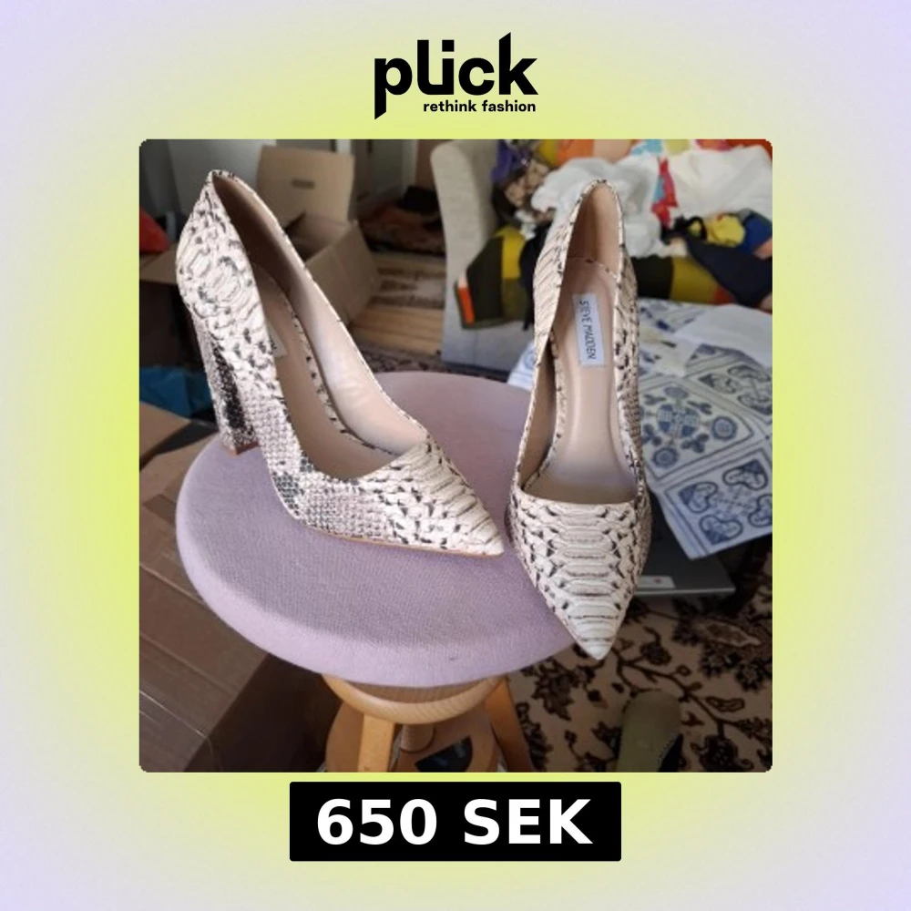 Säljer ett par snygga pumps från Steve Madden med ormskinnsmönster i beige och svart. Skorna har spetsig tå och hög, bred klack som ger extra stabilitet. Perfekta för dig som vill sticka ut med ett djurmönster.
