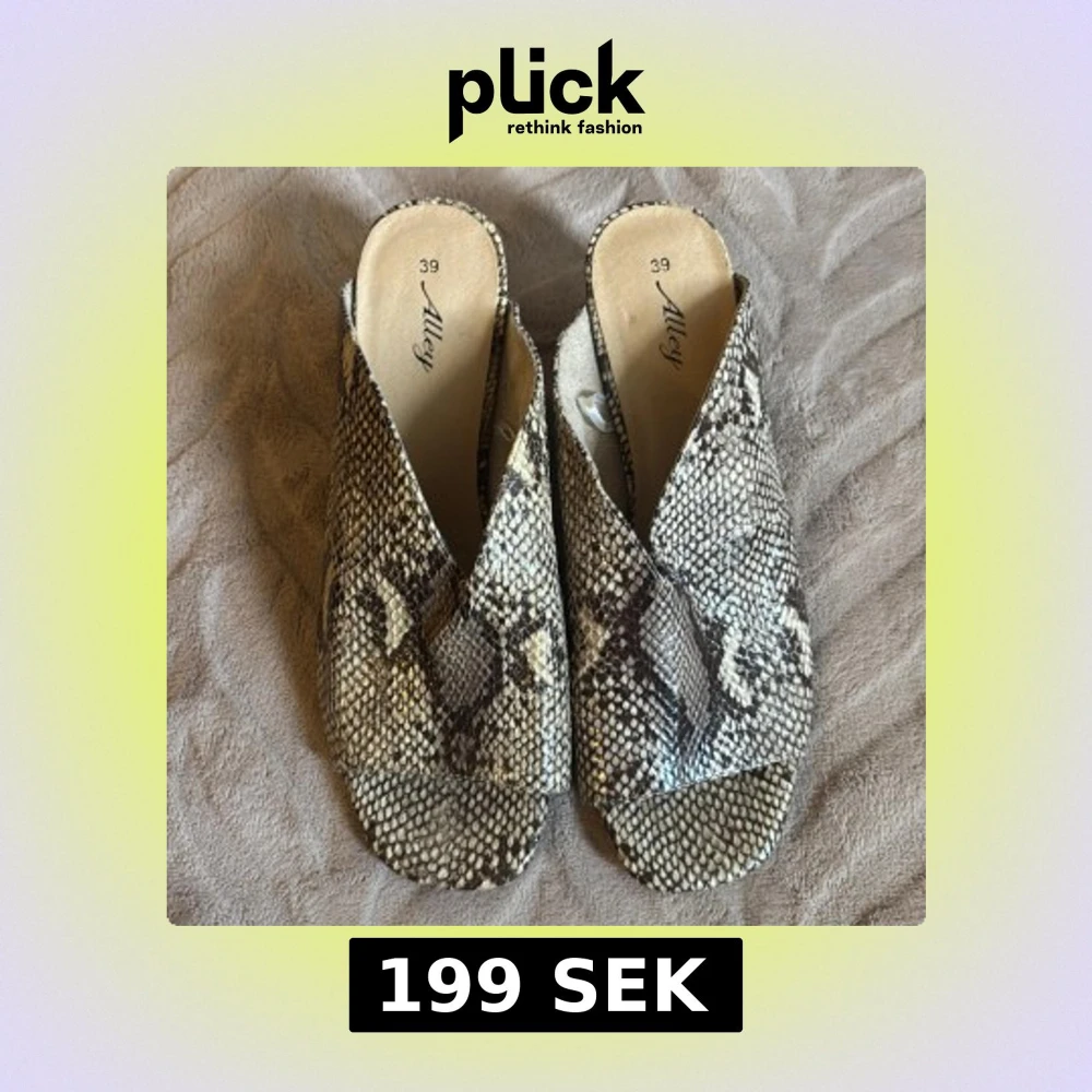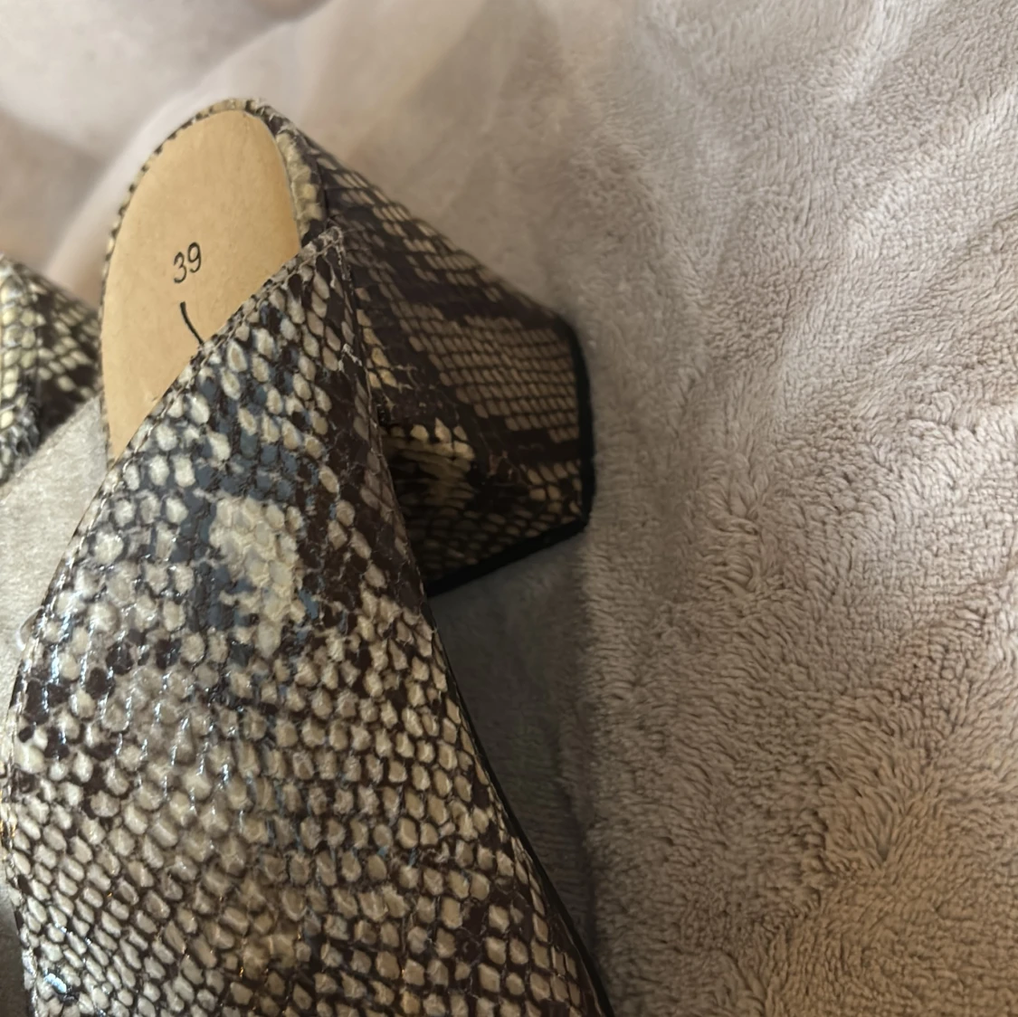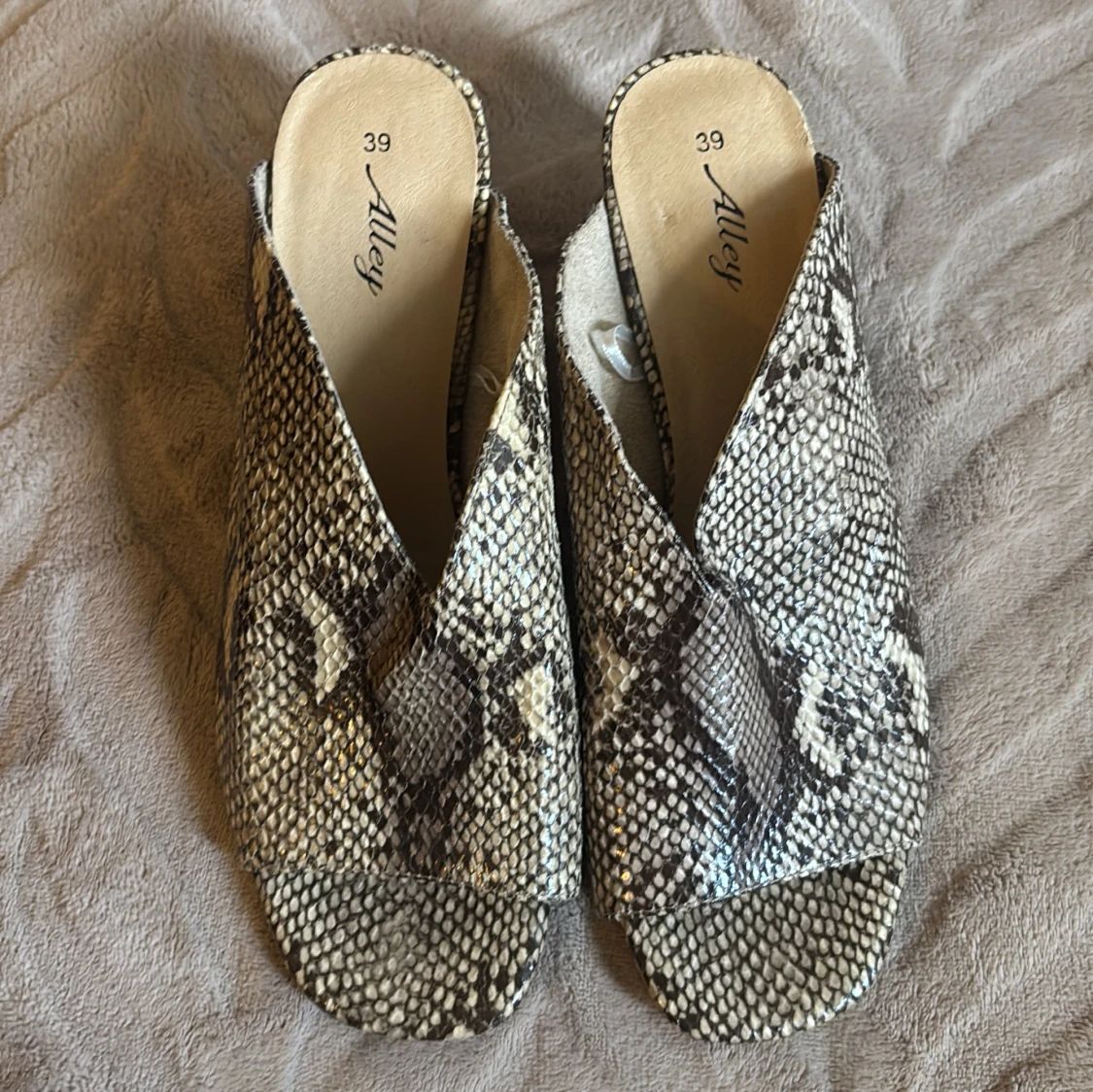 Säljer ett par sandaler från Alley i storlek 39 med ormskinnsmönster i beige och bruna toner. Skorna har öppen tå, bred klack och en snygg omlott-design framtill. Perfekta för dig som vill sticka ut med ett djurmönster och gillar chunky klackar.