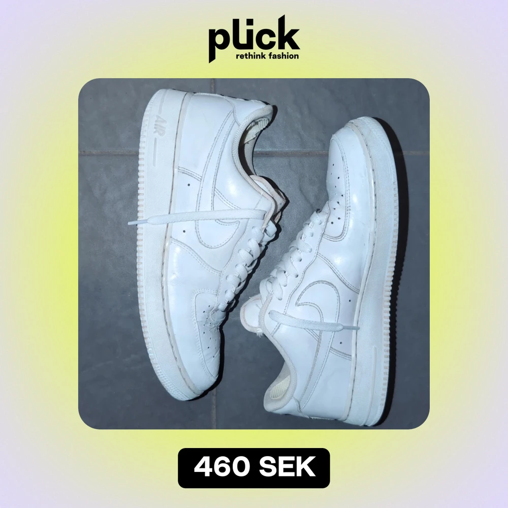 Säljer ett par klassiska vita Nike Air Force sneakers i bra skick. De har en stilren design med snörning och är perfekta för vardagsbruk. Skorna är i syntetmaterial och har en bekväm passform. Perfekta för all tid.