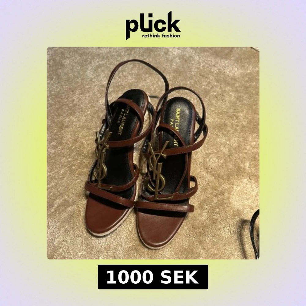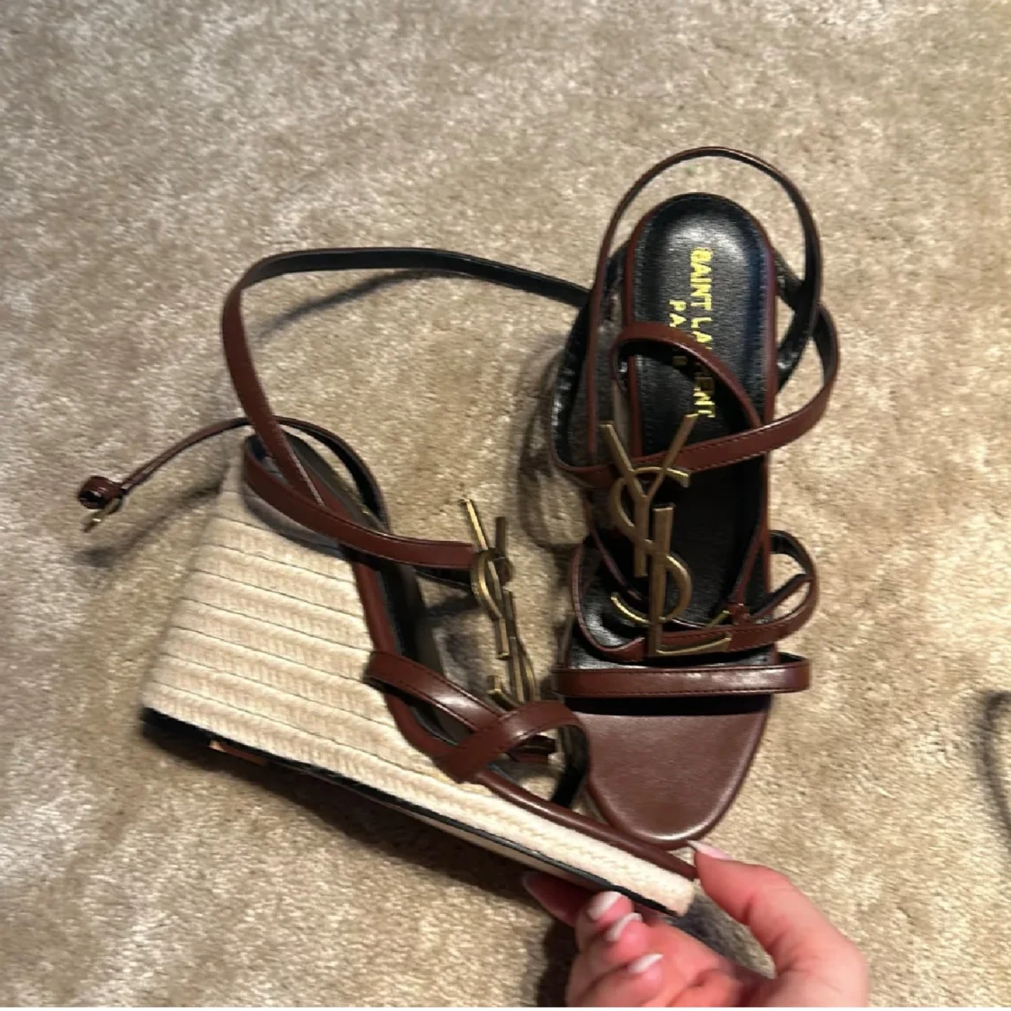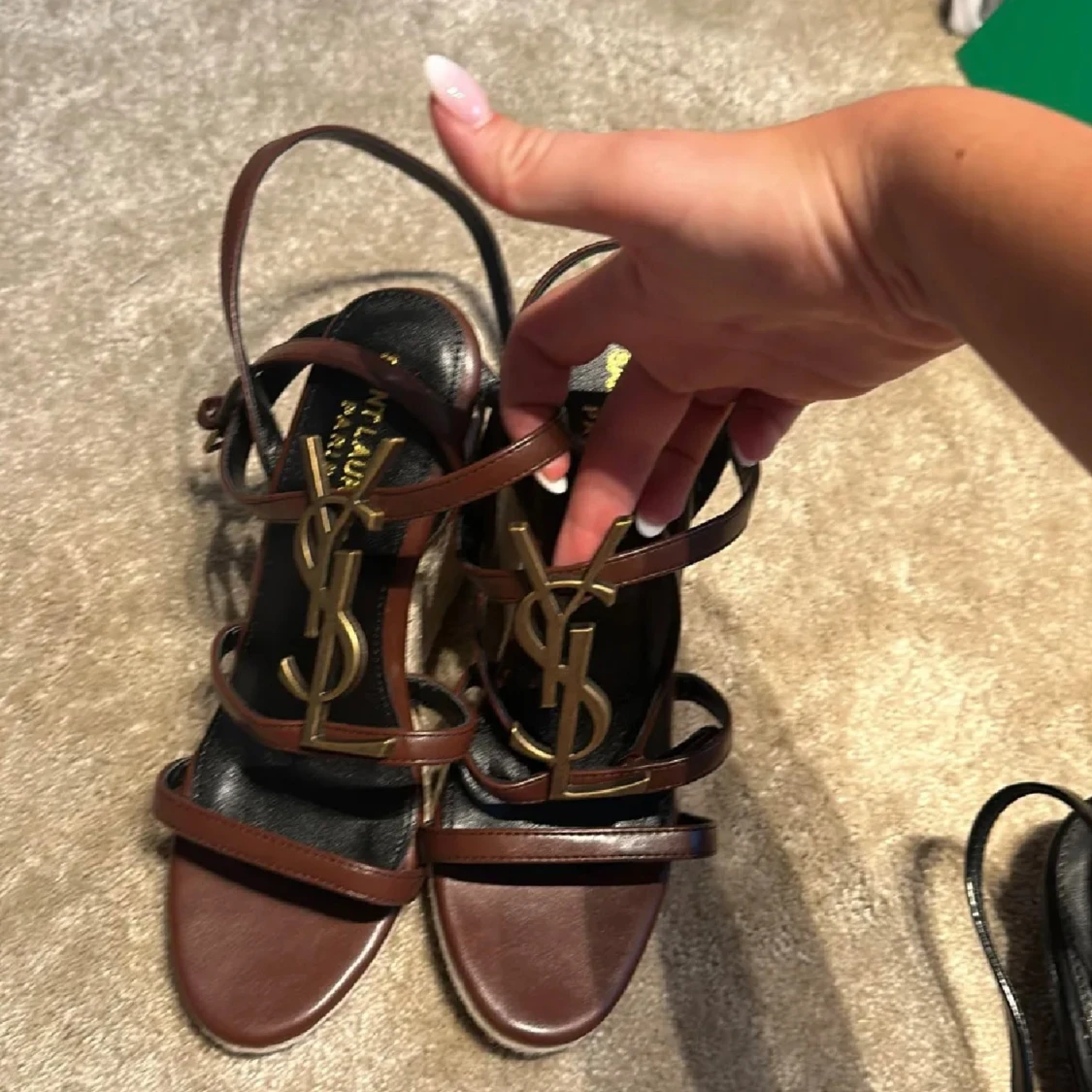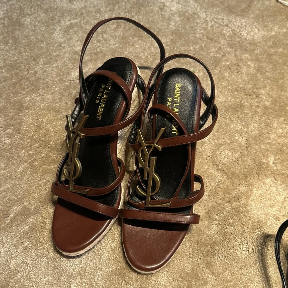 Snygga bruna sandaler med ikoniskt emblem i metall framtill. Skorna har flera smala remmar i skinn och en hög kilklack i repmaterial. Perfekta för att lyfta din sommarstil med en lyxig touch.