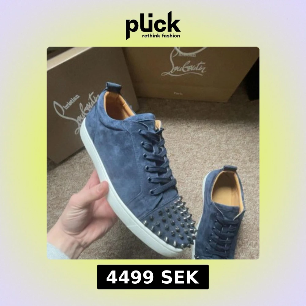 Jättesnygga navy Christian Louboutin (Louis n luck flat veau velours) Sneakers, just denna Christian Louboutin modellen är väldigt sällsynt, hittar inte ett ända par i den här storleken. Nypris är 9000, mitt pris 4499 men kan även gå ner i pris för rätta köparen. Nästan allt og följer med (ses på sista bilden) 3 spikar saknas på vänster skon men det går att köpa nya spikar. Storleken är 46.5 men CL har små storlekar så passar mig med 45.5 perfekt. Det var allt för mig❤️🍾