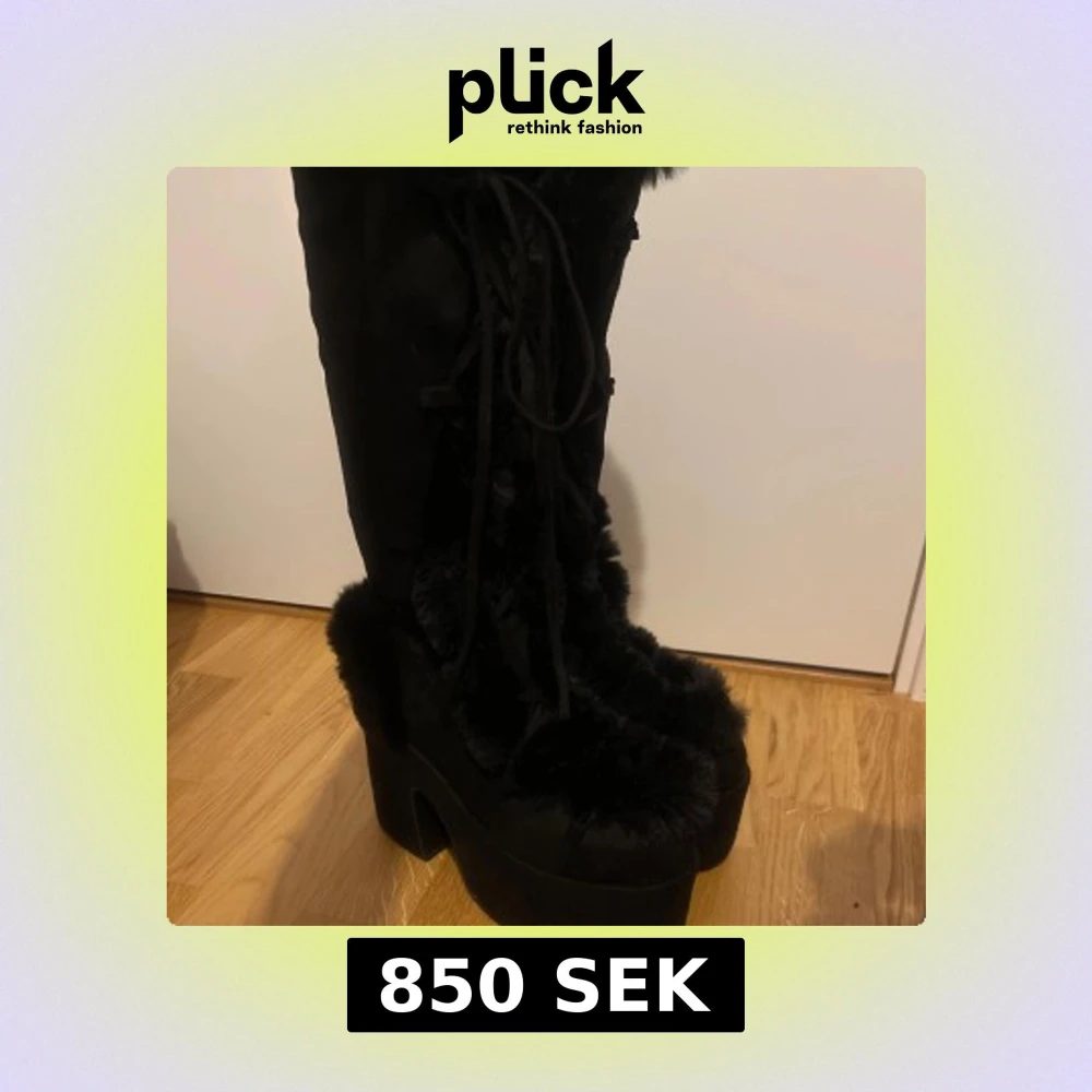 Unika svarta boots från märket demonia (camel 311) med hög platå och chunky klack. Skorna är täckta av mjuk päls och har snörning framtill samt dragkedja på sidan .Materialet är mockaliknande och pälsigt. Dom kom aldrig till användning så helt nytt skick