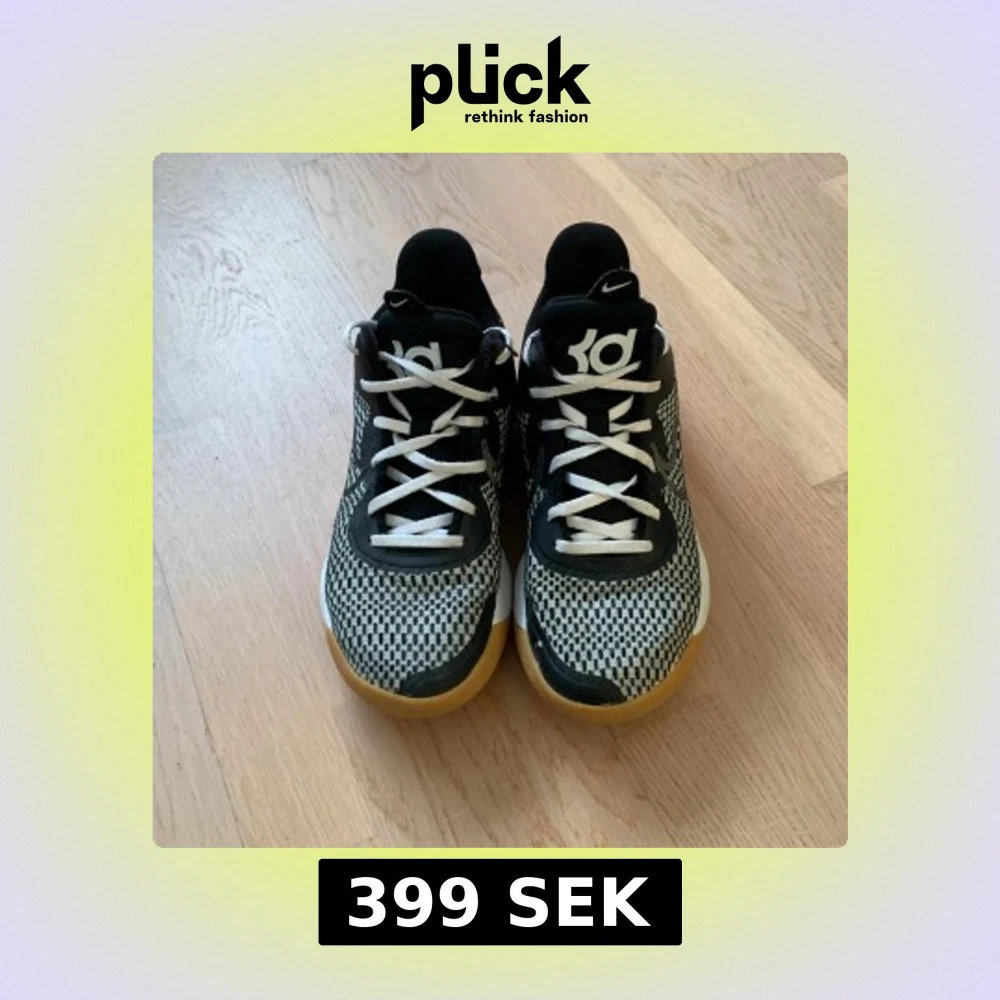 Snygga svartvita Nike KD basketskor med ett unikt mönster och vit snörning. Skorna har en gummisula i brun färg och är perfekta för en sportig look.