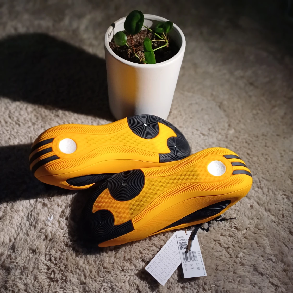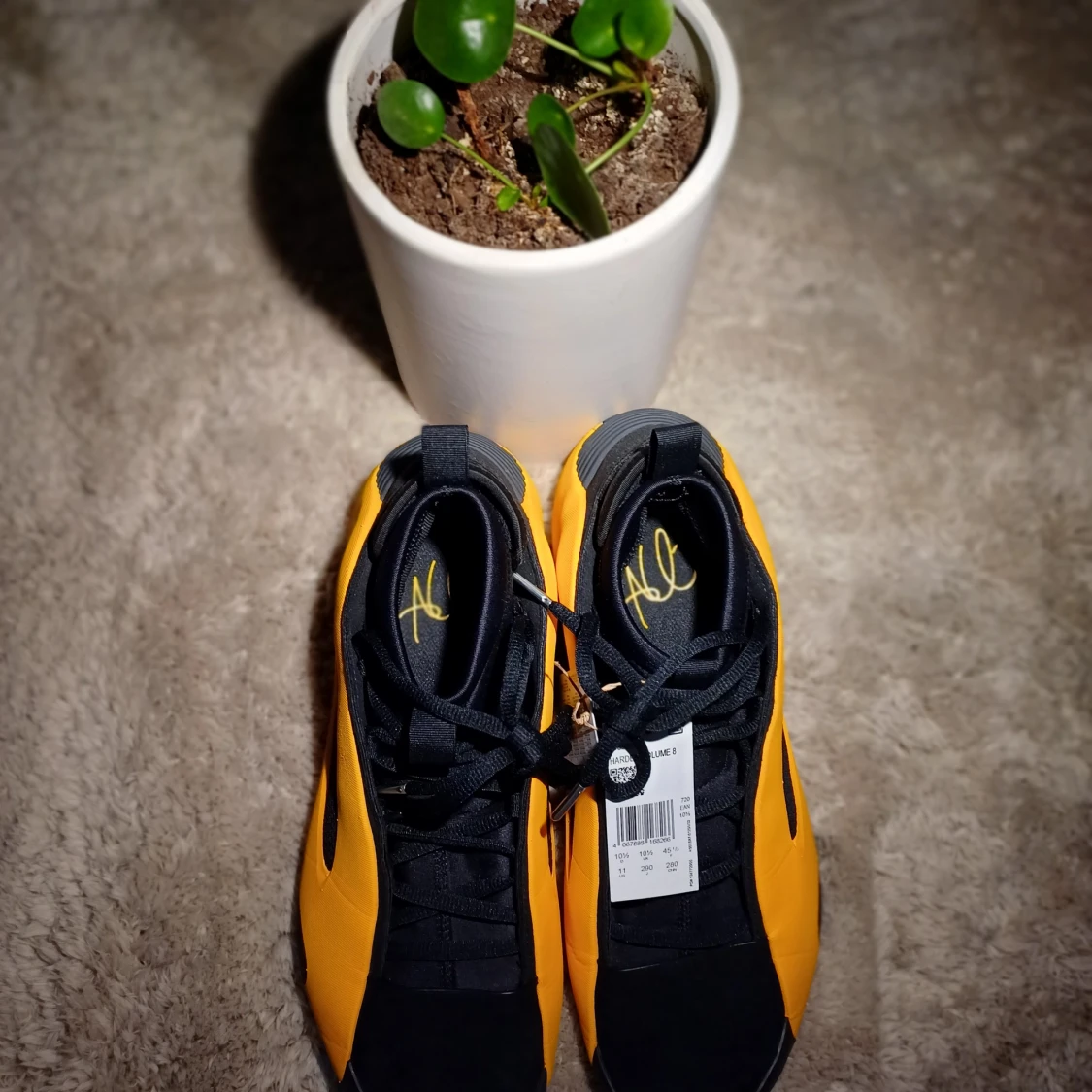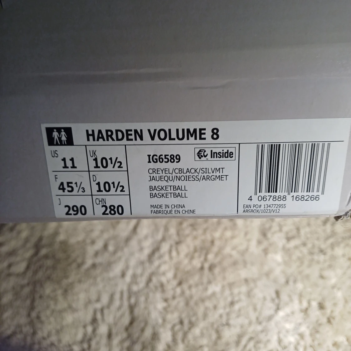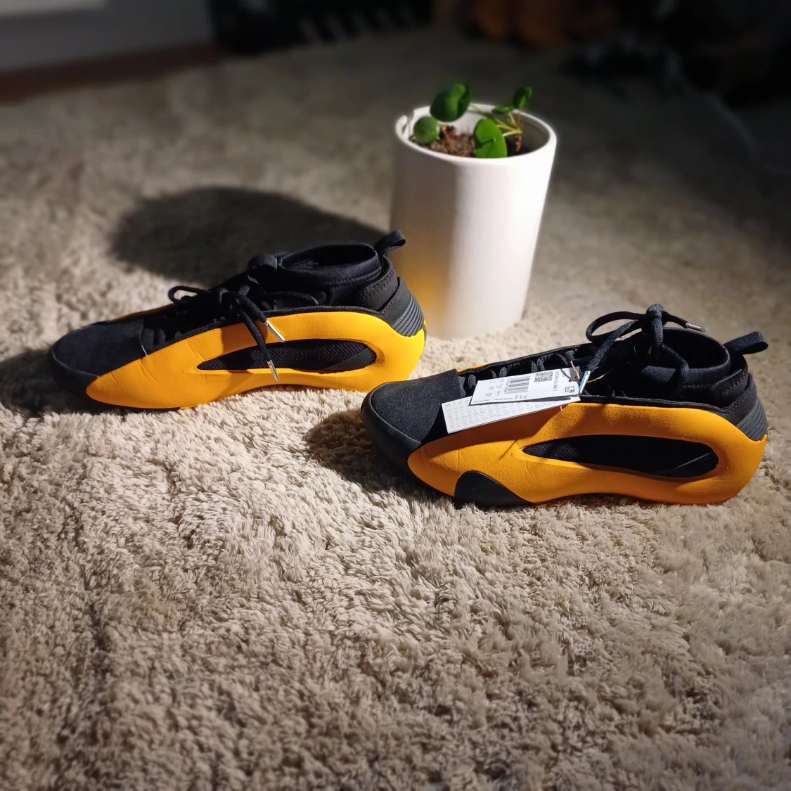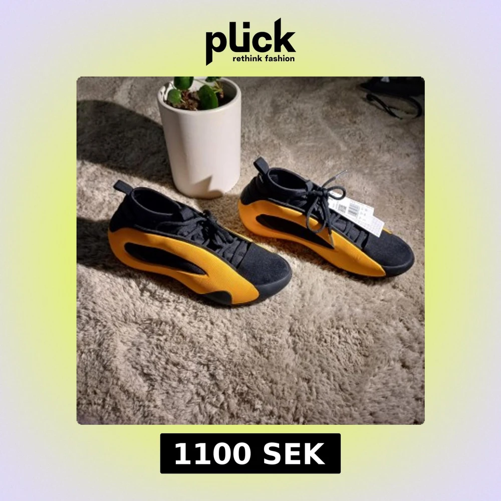 Ett par gula James harden vol 8 basketbollskor. Helt nya. Jag fick dem i present(julklapp) och sedan brött jag knät. När jag var läkt igen, hade skorna blivit för små för mig. Kvittot var digitalt och QR koden leder till Q.DID.AS som säljer riktiga skor från Adidas. Skorna kostade ungefär 1500 kr. Jag har ett digitalt kvitto, fast det står på tyska. Hör av er om ni vill att jag ska översätta eller skicka kvittot!!