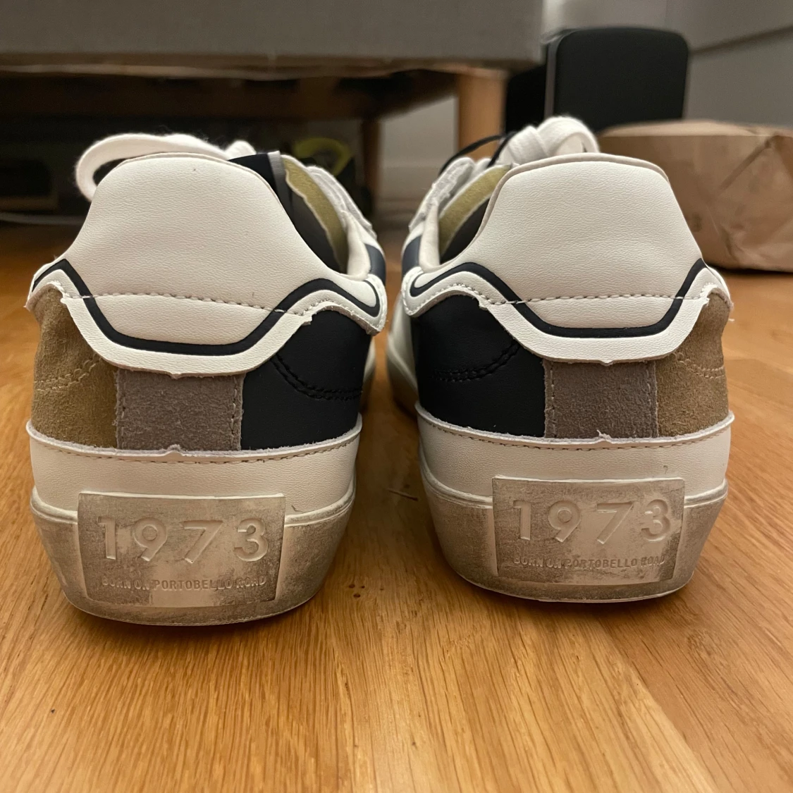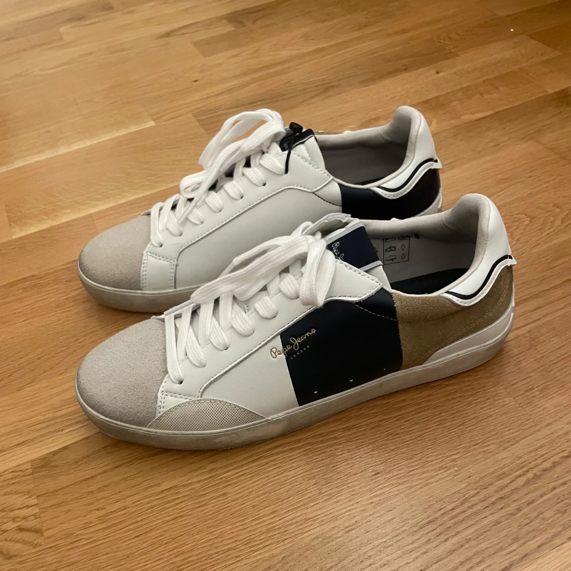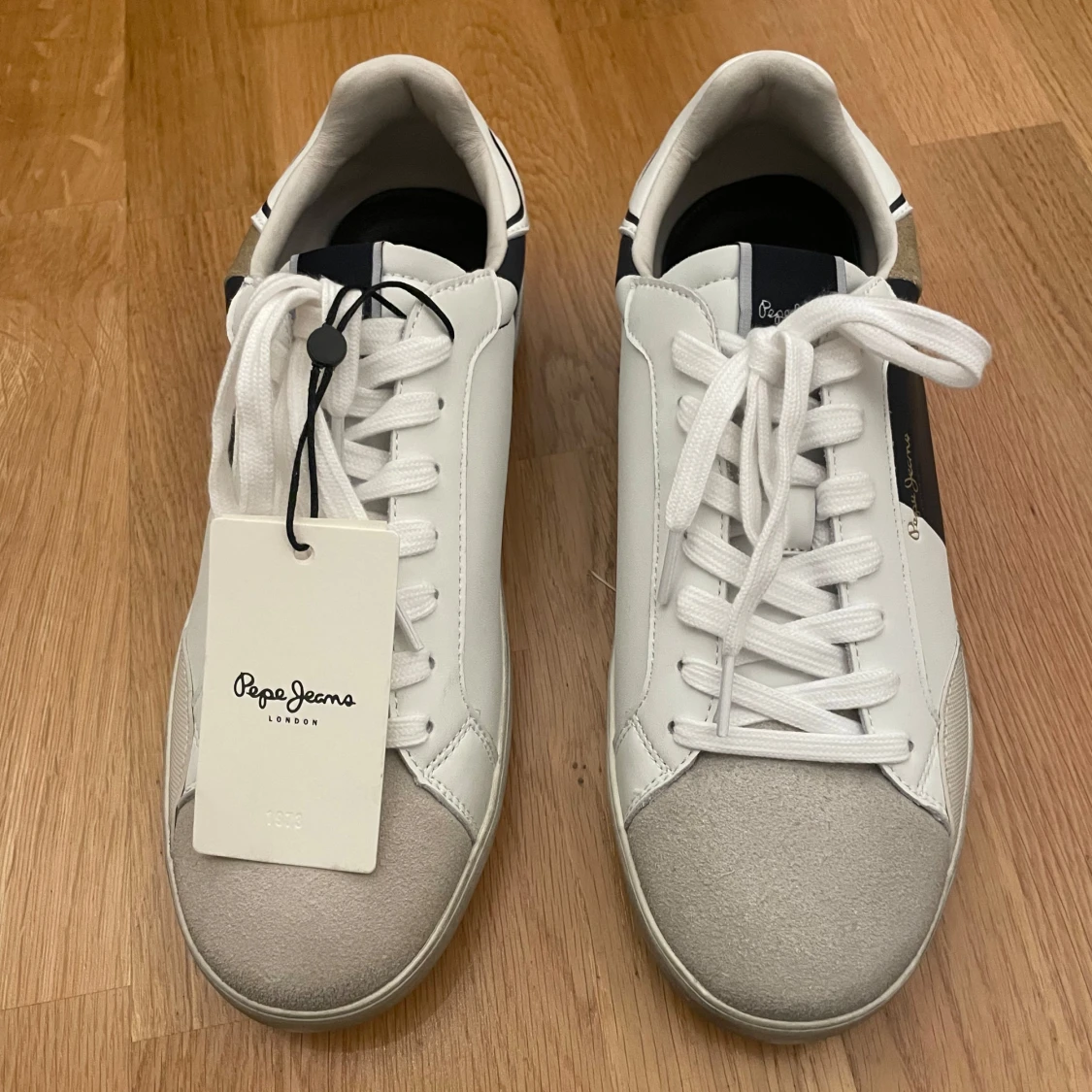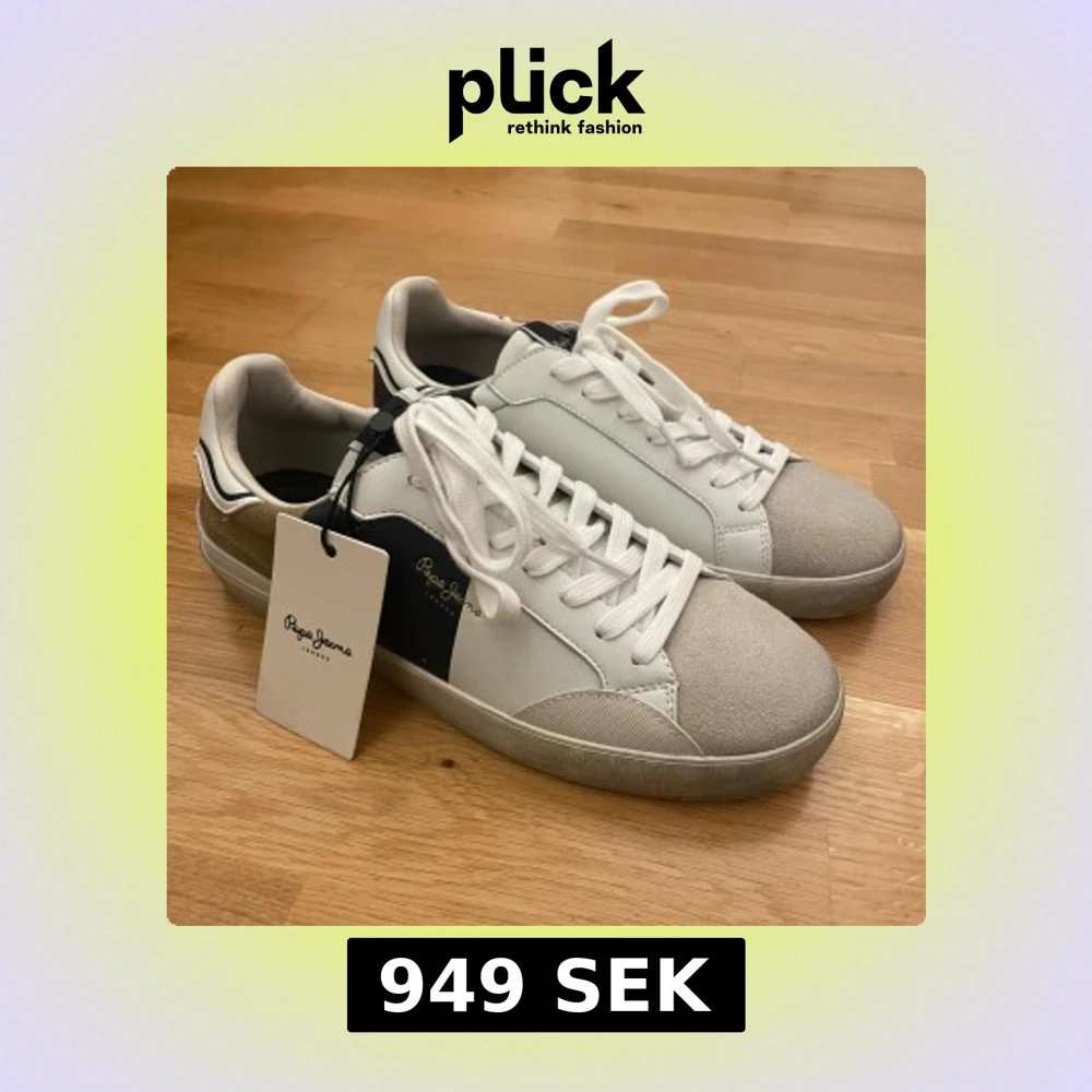 Säljer nu mina HELT NYA Pepe jeans sneakers, då jag köpte fel storlek (nog dom skönaste sneakersarna jag någonsin prövat) Det är som sagt ett par snygga sneakers från Pepe Jeans i vitt skinn med grå mockatå, beige och mörkblå detaljer på sidor och häl. Klassisk låg modell med snörning och vit sula. Märkt med '1973' bak på hälen och Pepe Jeans-logga i guld på sidan. Perfekta för en stilren och trendig look Storlek: 42