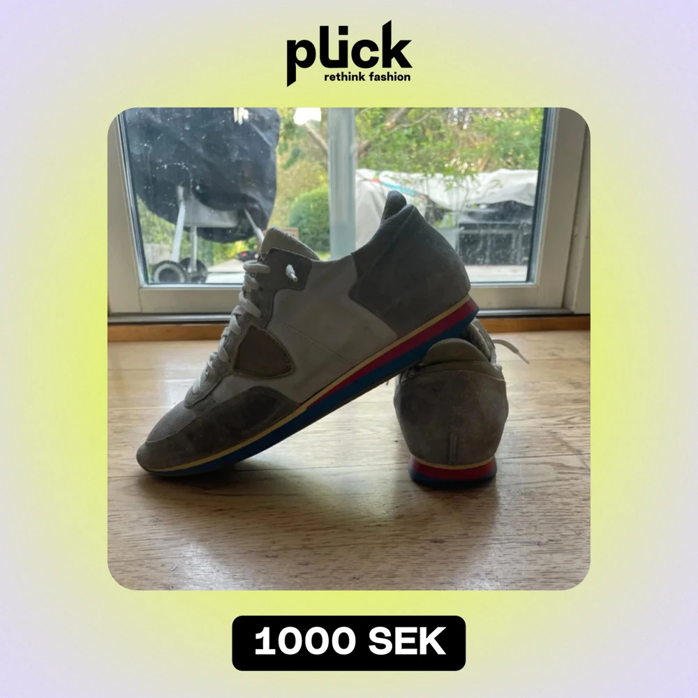 Snygga grå sneakers med en unik färgglad sula i rött, blått och gult. Skorna har snörning och en sköldformad detalj på sidan. Perfekta för en stilren och avslappnad look. Ingen box eller dust bag medföljer. Kan erbjuda mig att tvätta skorna innan jag skickar