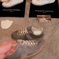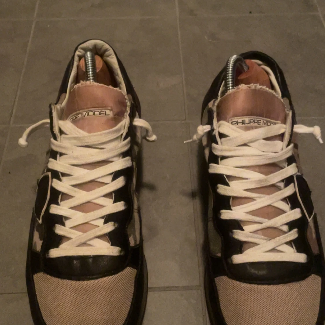 Snygga Philip model sneakers med camouflagemönster i grönt, beige och brunt. Skorna har svarta skinnpaneler, beige textil på tå och sidor samt vita snören. Ikonisk design med platt sula och rund tå, perfekt för dig som gillar streetstyle och exklusiva märken. Strl 42