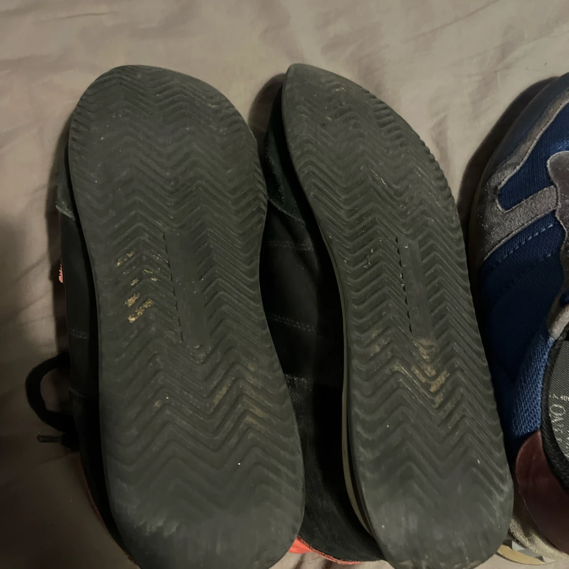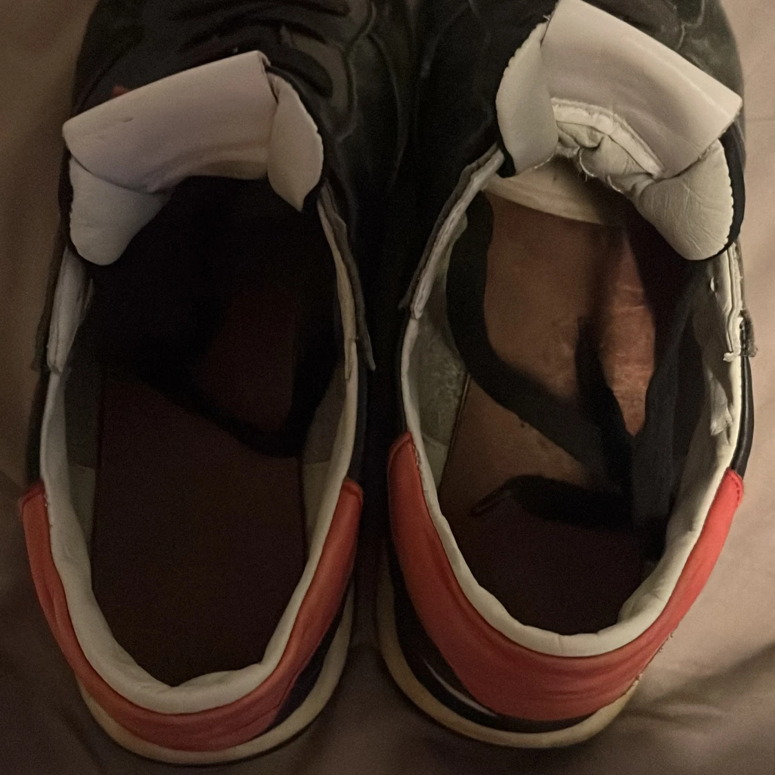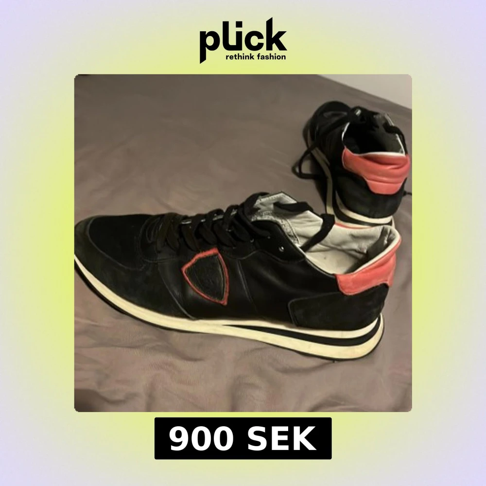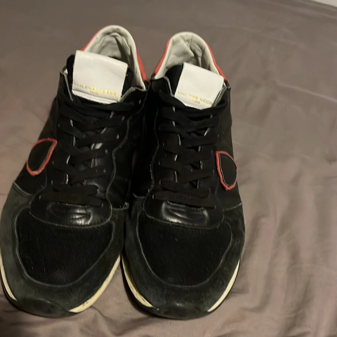 Säljer ett par philipe models i svart med röda detaljer och vit sula. Skorna har snörning, rund tå och är tillverkade i skinn och mocka. Snygg kontrast mellan svart och rött, med klassisk Rockrunner-panel på sidan. Perfekta för dig som gillar exklusiva sneakers. Skorna har ingen innersula