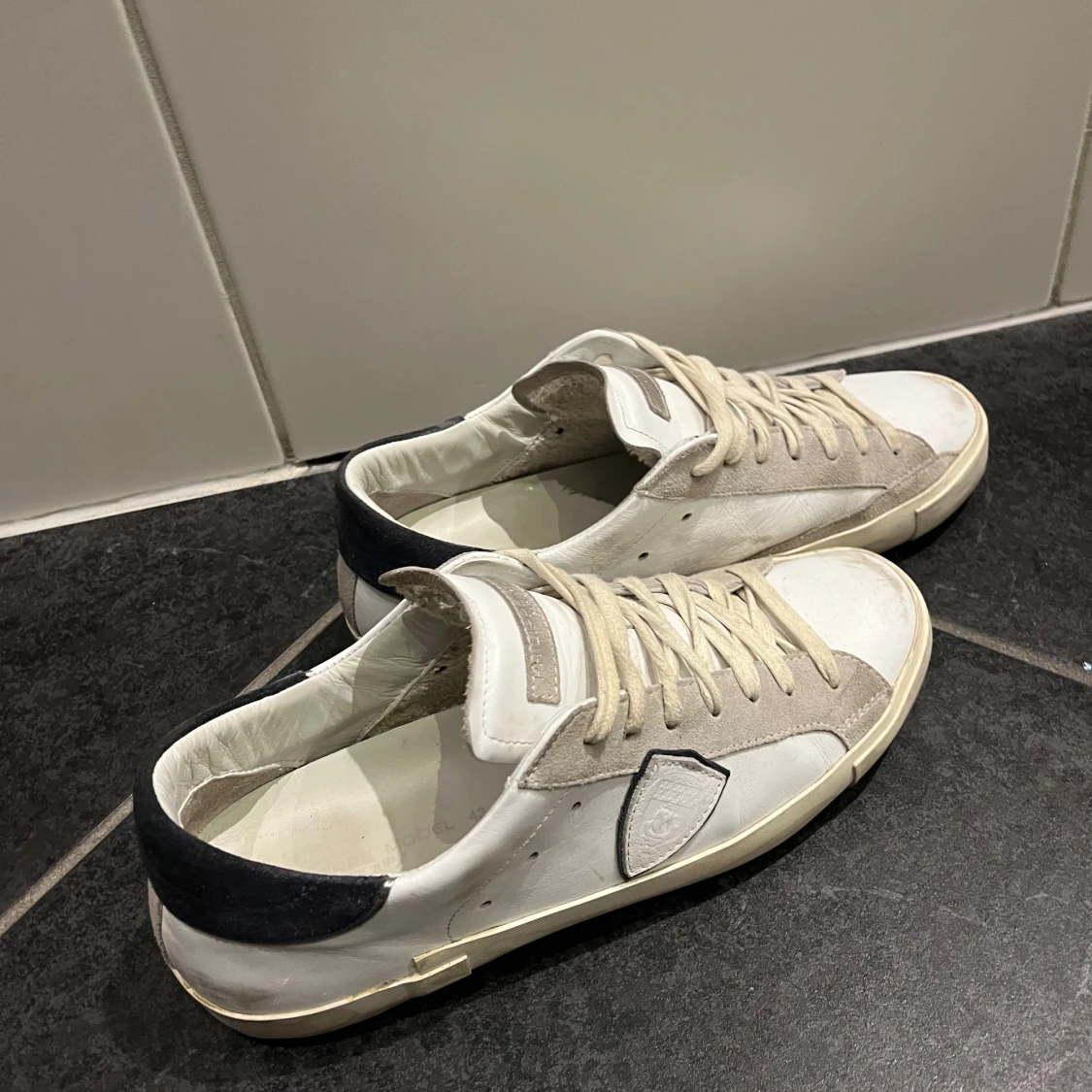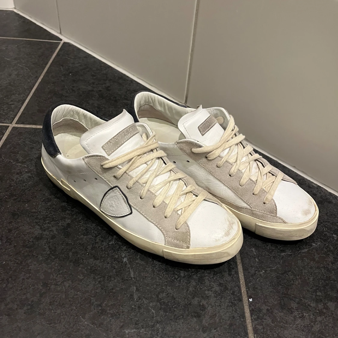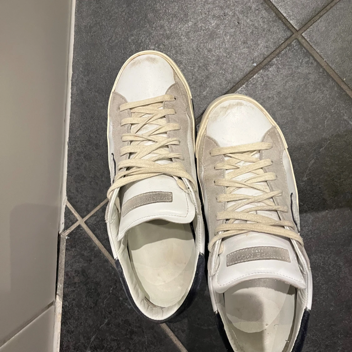 Snygga vita sneakers från Philippe Model med beige mockadetaljer och mörkblå häl. Skorna har snörning, rund tå och en platt sula. Tillverkade i skinn och mocka för en lyxig känsla. Perfekta för dig som gillar stilrena och trendiga sneakers. De är använda ett par gånger men de är bra skötta.