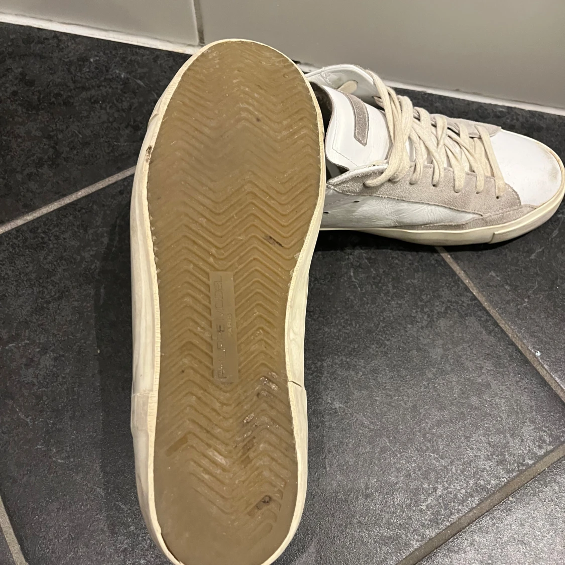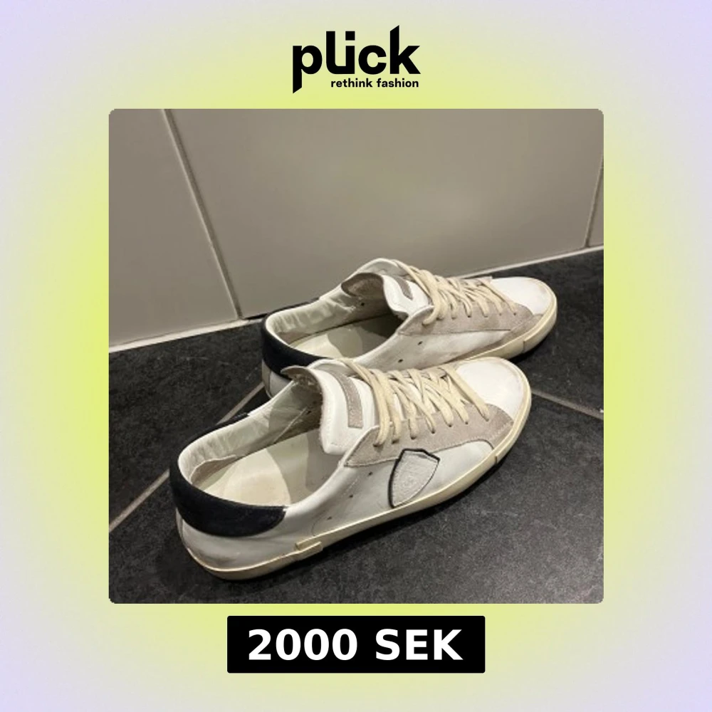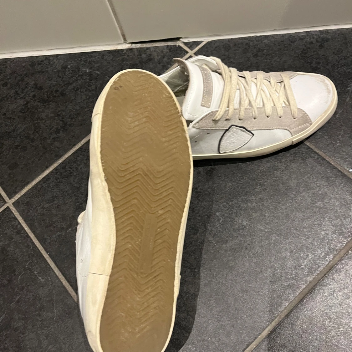 Snygga vita sneakers från Philippe Model med beige mockadetaljer och mörkblå häl. Skorna har snörning, rund tå och en platt sula. Tillverkade i skinn och mocka för en lyxig känsla. Perfekta för dig som gillar stilrena och trendiga sneakers. De är använda ett par gånger men de är bra skötta.
