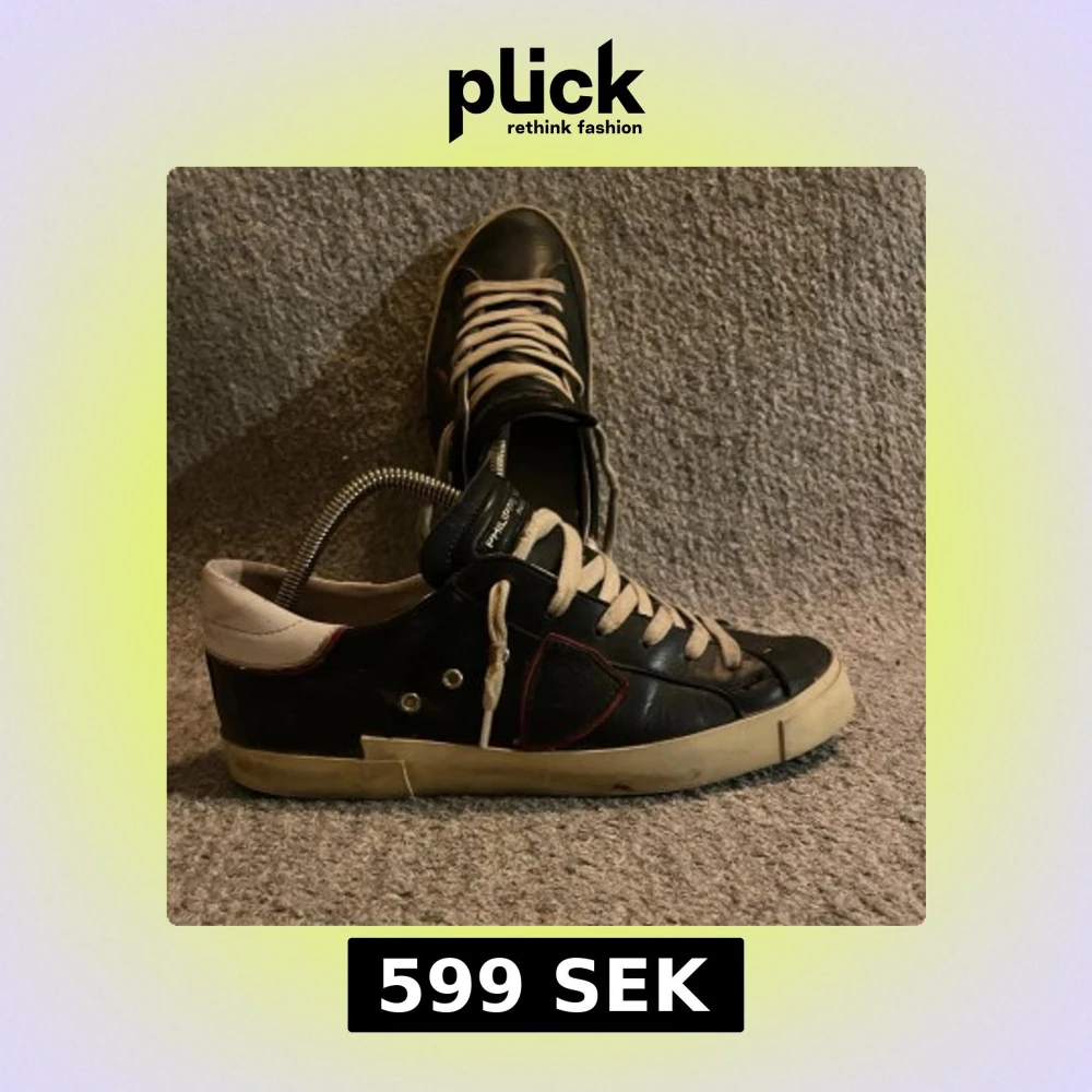 Svarta skor från Philippe Model. Skorna är i okej skick. Storleken är 40 men sotter som 41. Dessa är för små för mig och därför jag säljer dom. Har tyvärr ingen box eller övriga delar. Skorna är lite smutsiga nu men tvättar såklart innan köp. Hör av er om ni har funderingar!