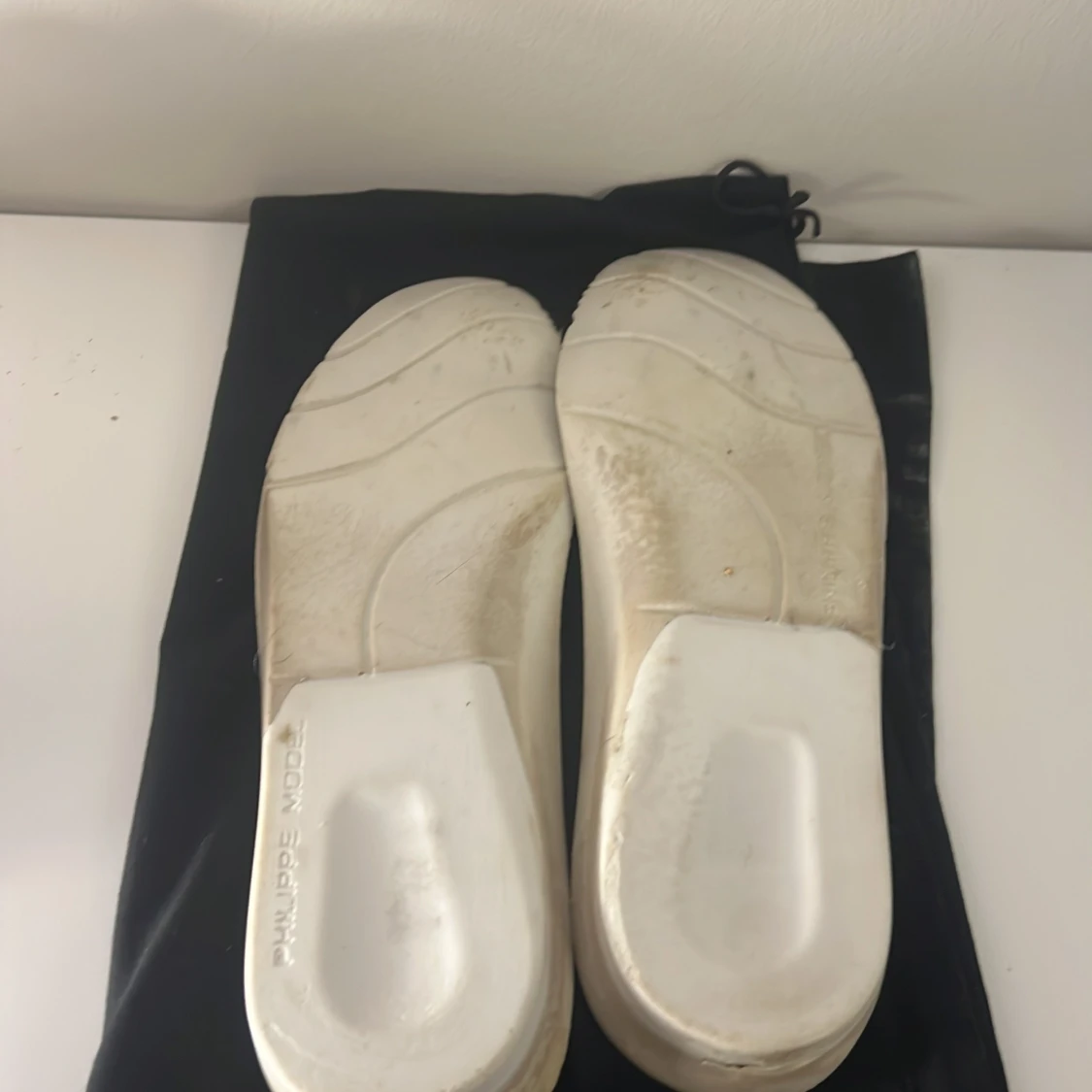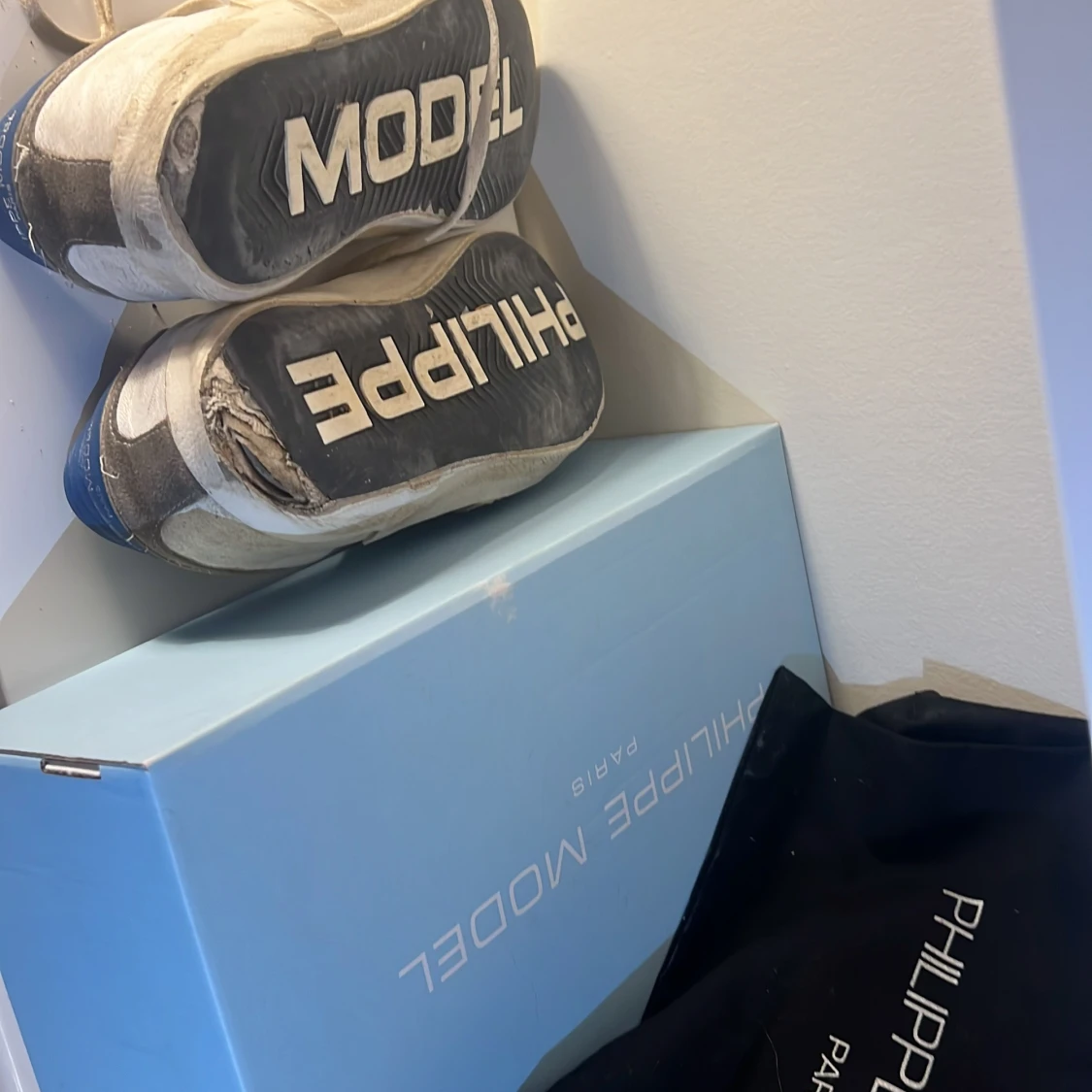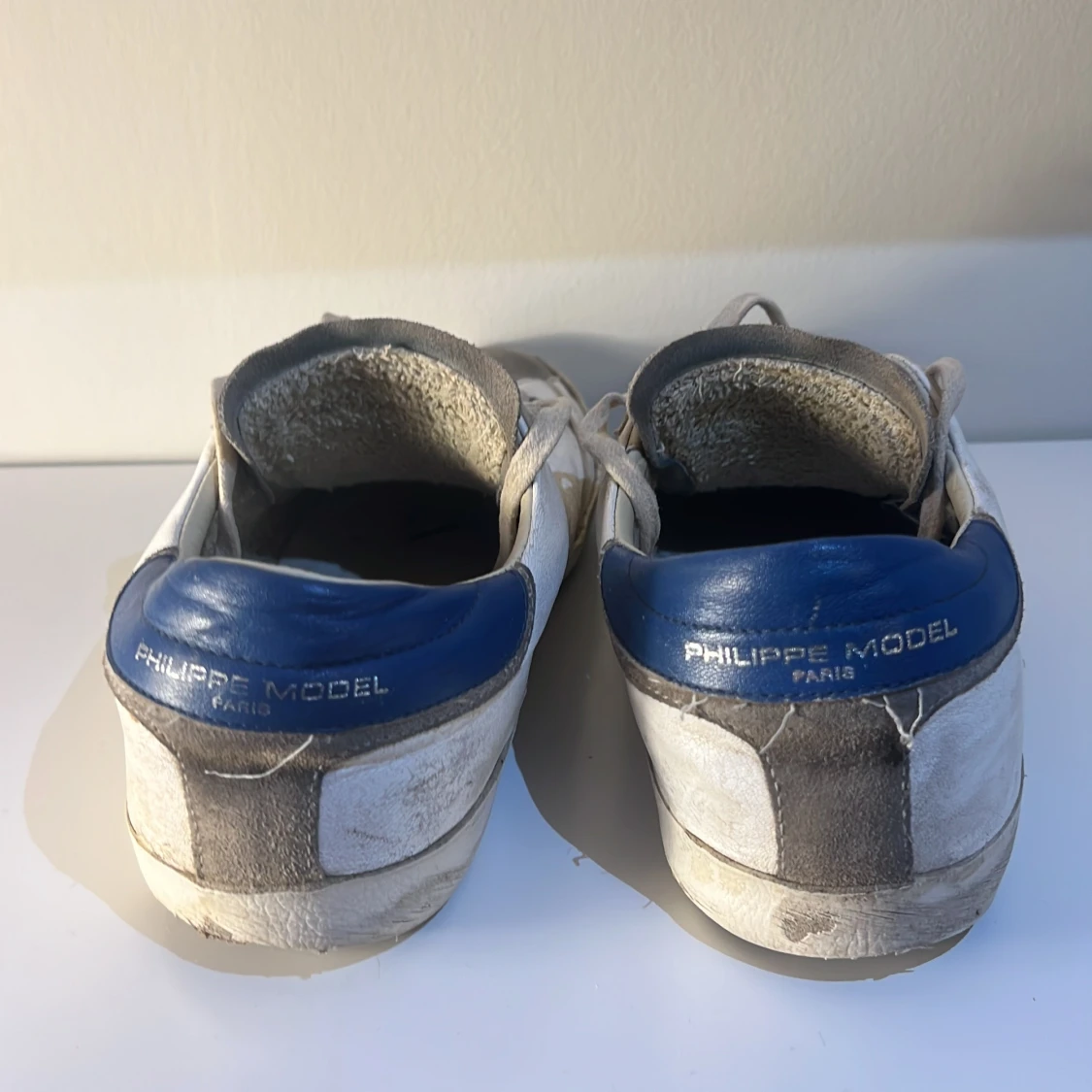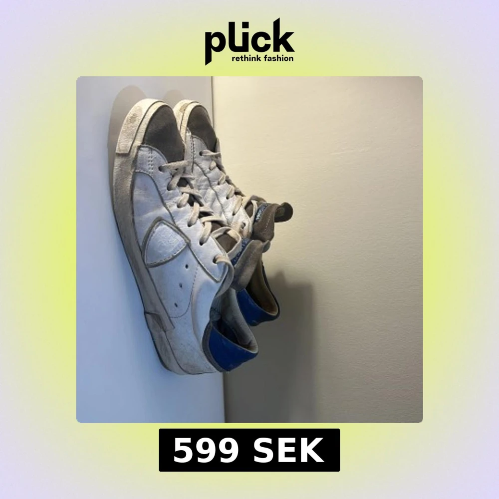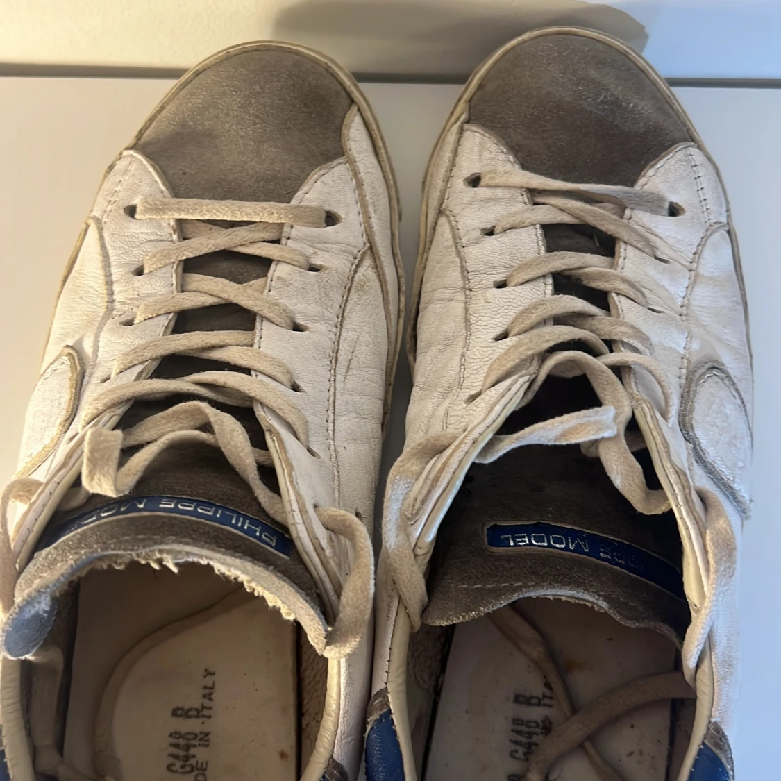 Snygga vita Philippe Model sneakers med grå mockadetaljer och blå hälkappa. Skorna har snörning, rund tå och är tillverkade i skinn och mocka. Märkeslogga syns på hälen och sidan. Skorna är köpta i Kicksnstuff i göteborg för 2699kr. Storlek 39.