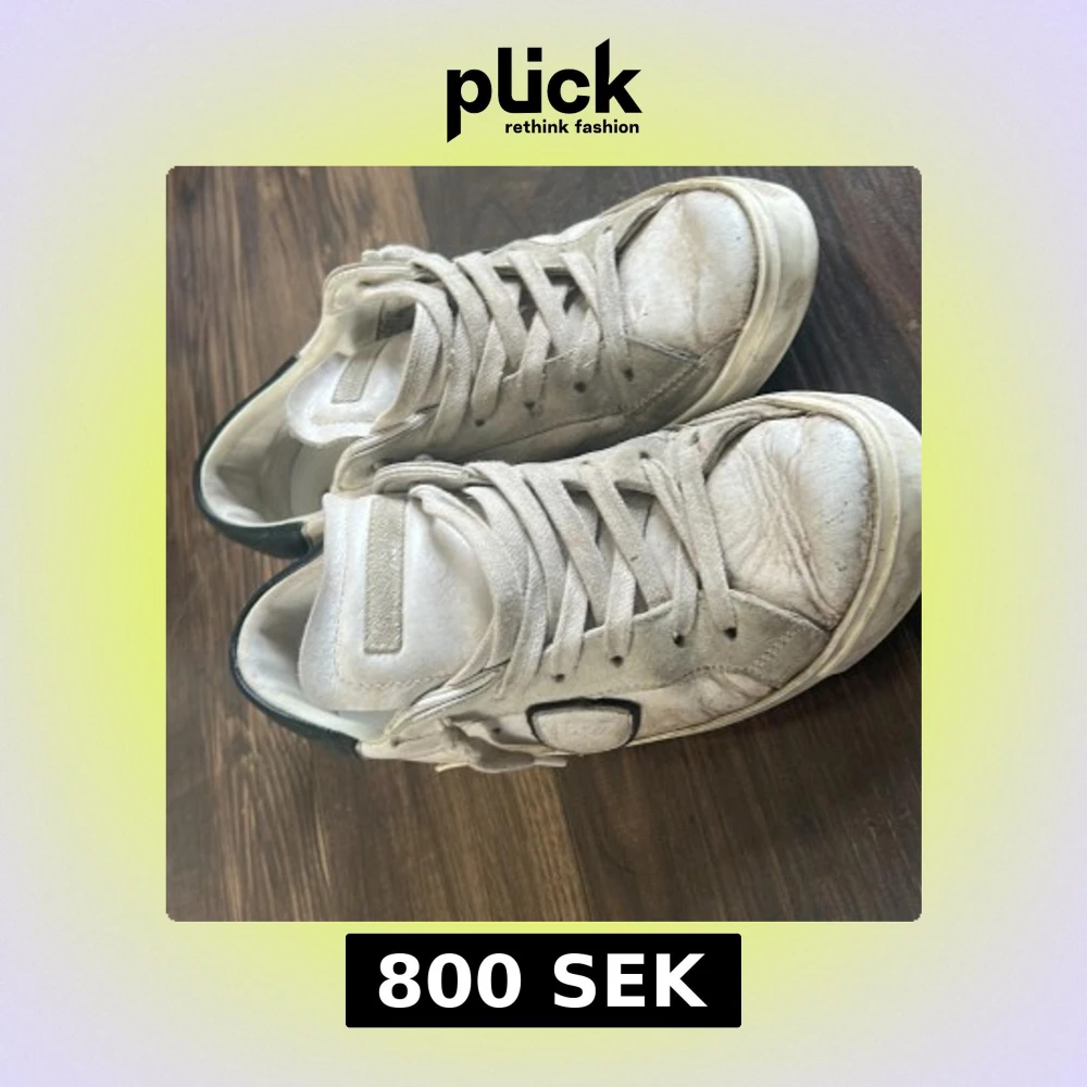 Snygga vita sneakers från Philippe Model i skinn med svarta detaljer på hälen och klassisk snörning. Skorna har en rund tå och platt sula, samt diskret logga på sidan. Perfekta för en clean och stilren look. Du får med box o dustbag jag börjar med 800kr men priset kan diskuteras. Skriv om ni är intresserade!!