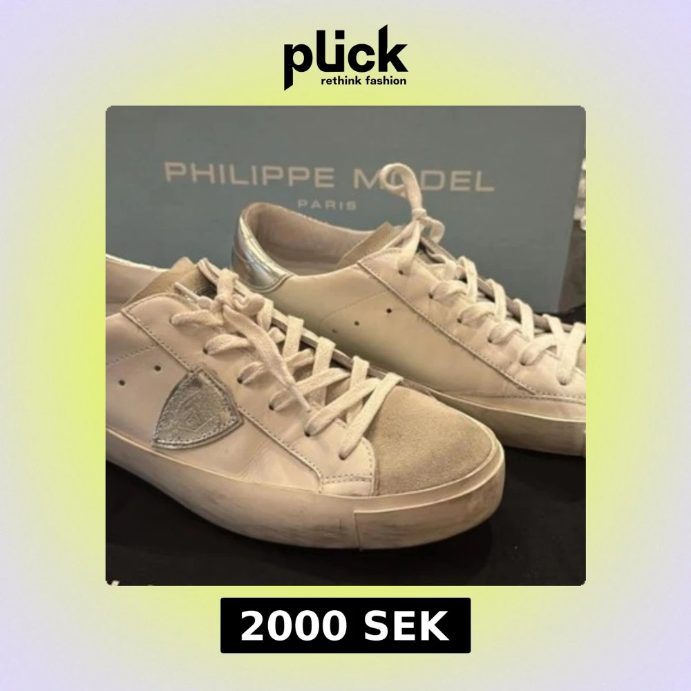 Snygga vita sneakers från Philippe Model med silvriga detaljer. Ovandelen är i skinn med mockadetalj på tån och silvermärke på sidan. Perfekta för dig som gillar stilrena och trendiga sneakers. Dem är helt nya och köptes på miinto för 3.426,65 kr, bekräftelse finns på sista bilden. Original kartong och dustbag medföljer.