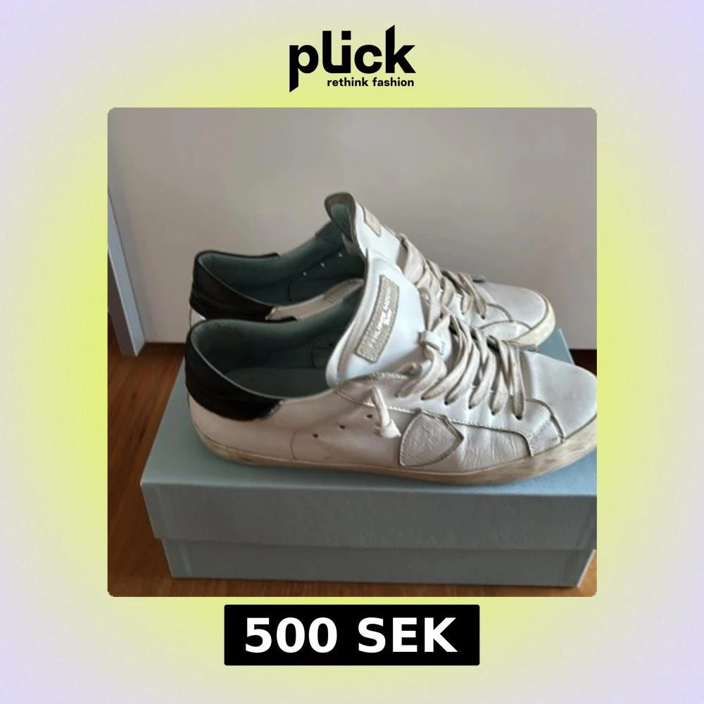 Säljer ett par vita sneakers från Philippe Model med svarta detaljer på hälen och bruna gummisulor. Skorna har snörning och en klassisk låg profil. Perfekta för en stilren och avslappnad look.
