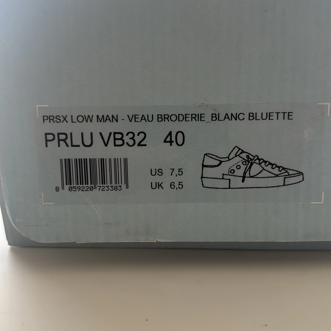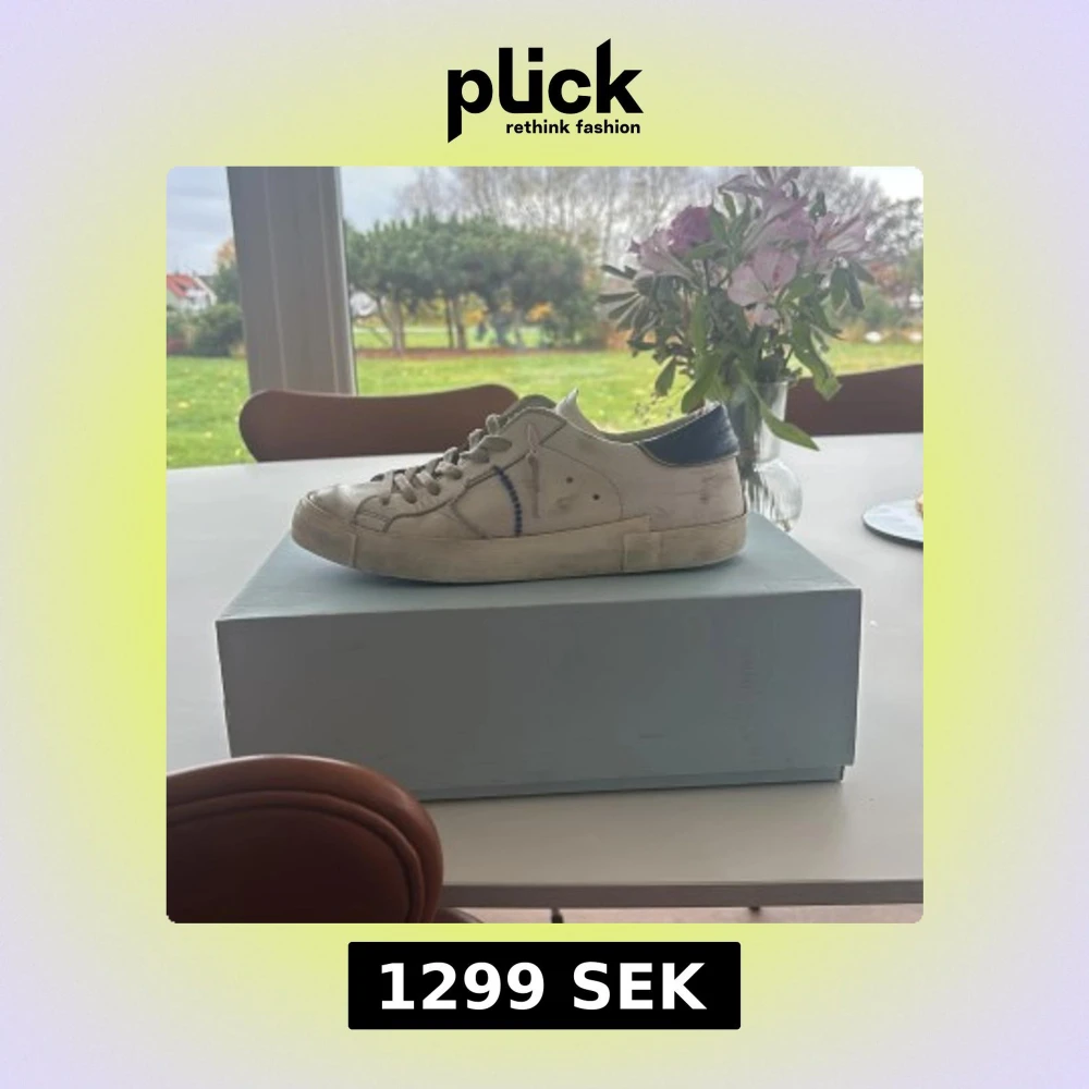 Säljer ett par Philippe Model PRSX Low Man sneakers i vitt skinn med blå detaljer på häl och sidor. Klassisk låg modell med snörning och platt sula. Snygg broderad detalj på sidan och mörkblå yttersula. Perfekta för en clean och stilren look. Köpta nya för 3800kr prisklass kan såklart diskuteras!