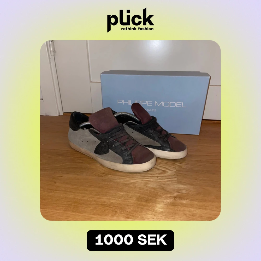 Säljer ett par Philippe Model sneakers i snygg färgkombination av svart, grå och vinröd. Skorna har en klassisk design med snörning och är i bra skick. Perfekta för både vardag och festliga tillfällen. Originalkartong medföljer. Sulan på skorna är lite sluta men inget märkvärdigt.