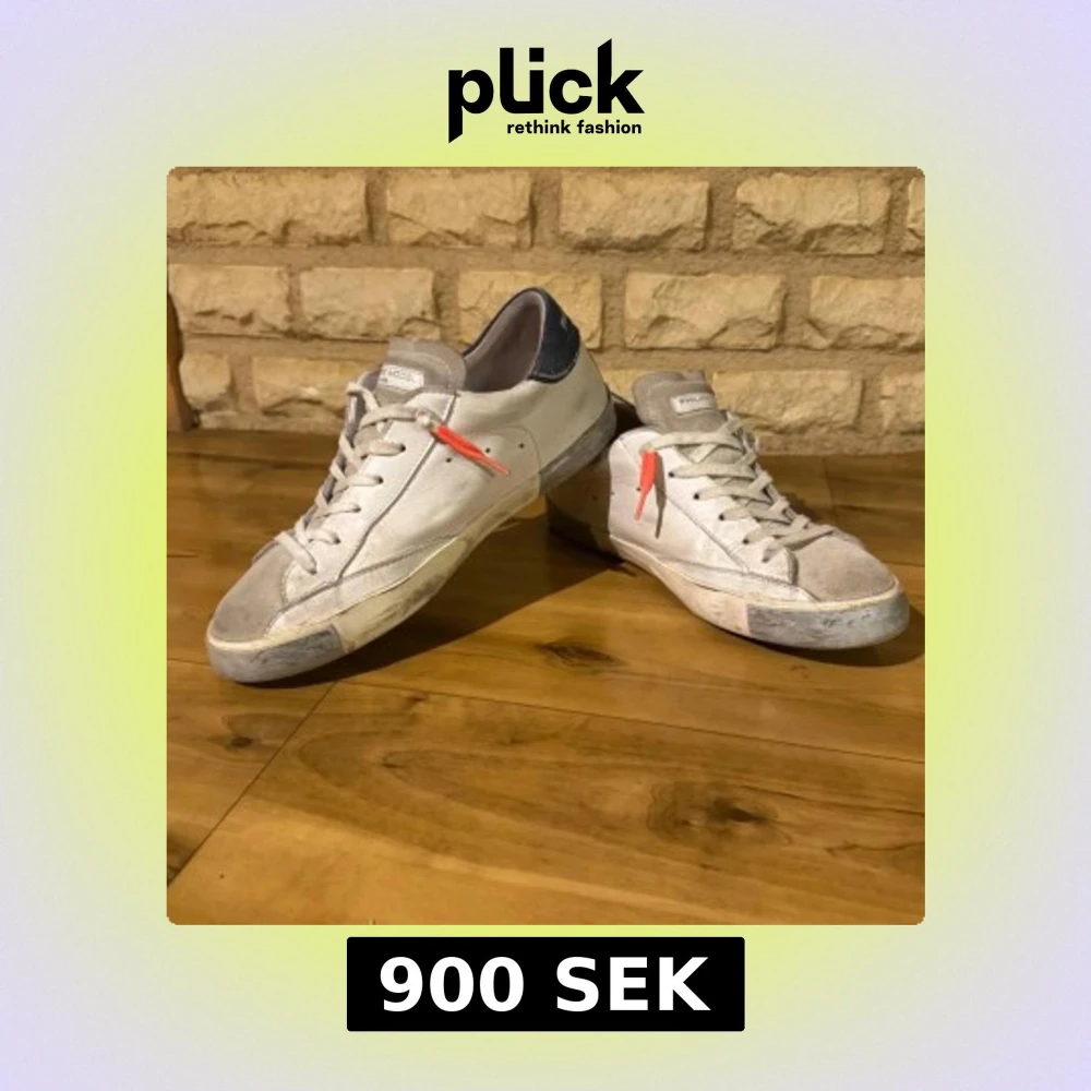 Snygga vita sneakers från Philippe Model med grå detaljer och en orange accent på sidan. Skorna har snörning och en rund tå. Pris kan diskuteras