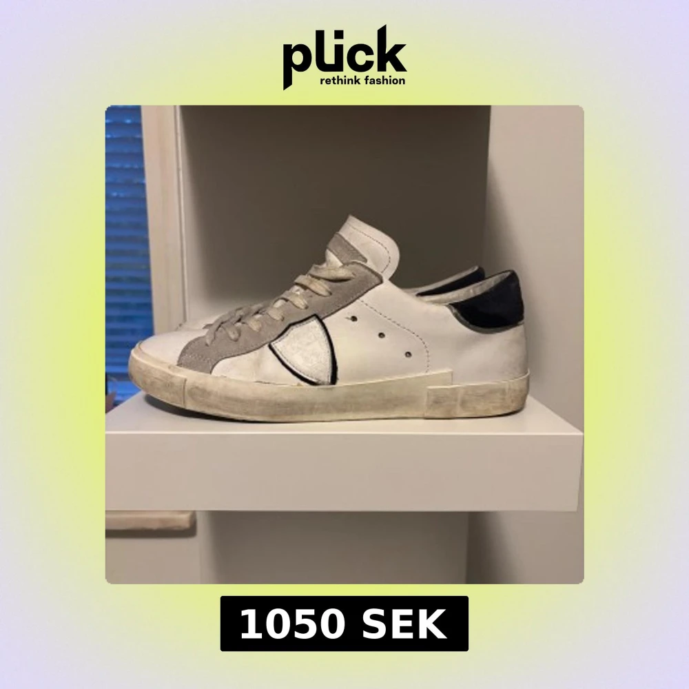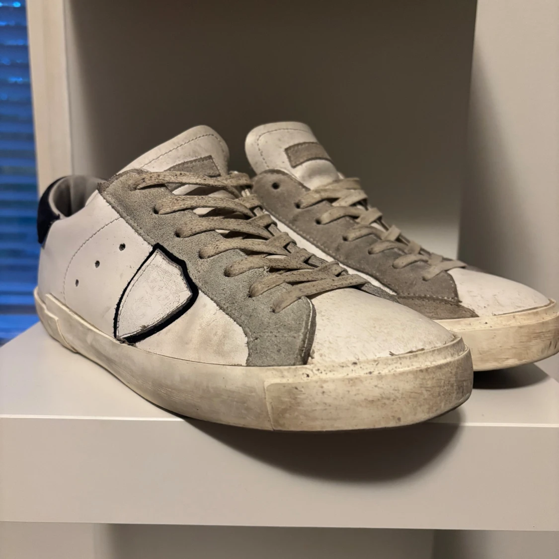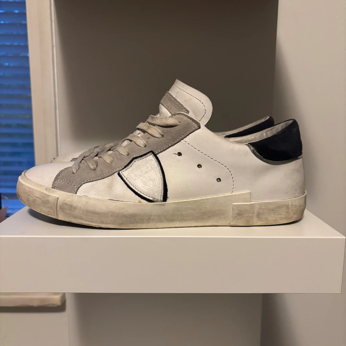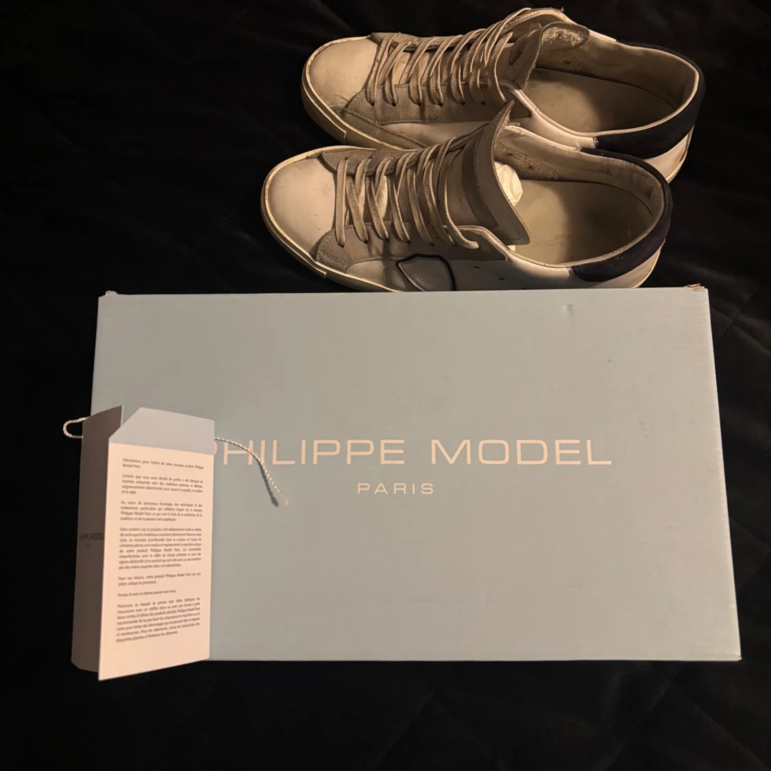 Snygga vita sneakers från Philippe Model med marinblå mockadetaljer och svart häl. Skorna har klassisk snörning, rund tå och en platt sula. Tillverkade i skinn och mocka för en lyxig känsla. Kommer med originalkartong.