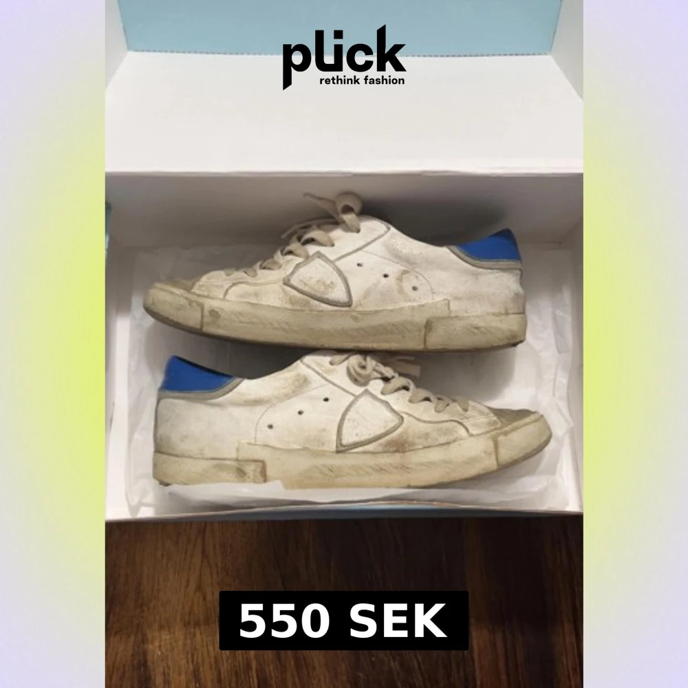 Säljer ett par klassiska Philippe Model sneakers i vitt skinn med blå detaljer vid hälen. Skorna har rund tå, snörning och platt sula med logotyp under. Snyggt street-utseende och coola paneler på sidorna. Perfekt för dig som gillar fransk design och vill sticka ut.