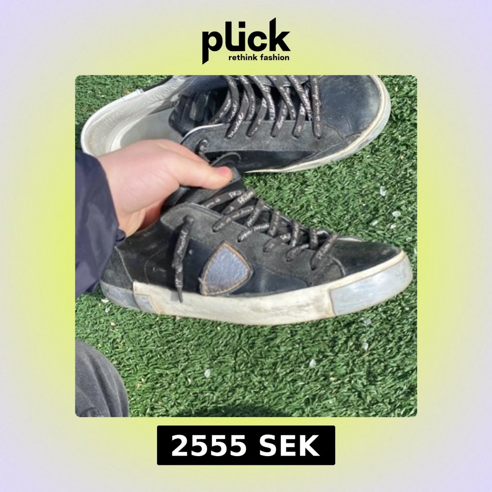 Säljer ett par svarta sneakers från Philippe Model med grå detaljer och vit sula. Skorna har snörning och en ikonisk sköld på sidan. Perfekta för dig som gillar en sportig och stilren look.